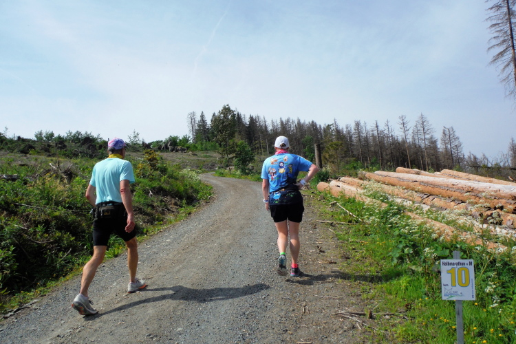 Die nächsten Kilometer führt die Strecke am Fuße der Berge leicht bergan. Im dichten Wald gibt es nur vereinzelt Ausblicke in die norddeutsche Tiefebene. Mir soll es recht sein, denn ich genieße die noch kühle Luft. Nach etwas mehr als 5 KM ist es dann soweit. Die Strecke windet sich nach Südwesten um den Weinbergskopf herum. Die Steigung nimmt deutlich zu, es darf ruhig schon mal gegangen werden. Rechts zeugen die ersten dürren Nadelbäume vom Überlebenskampf des Waldes. Nach der nächsten Spitzkehre werden wir an der Verpflegungsstelle Adenberg erwartet. Damit es uns nicht wie dem Wald geht, tanken wir ordentlich auf, zudem gönne ich mir etwas von den angebotenen Äpfeln und Salzbrezeln.