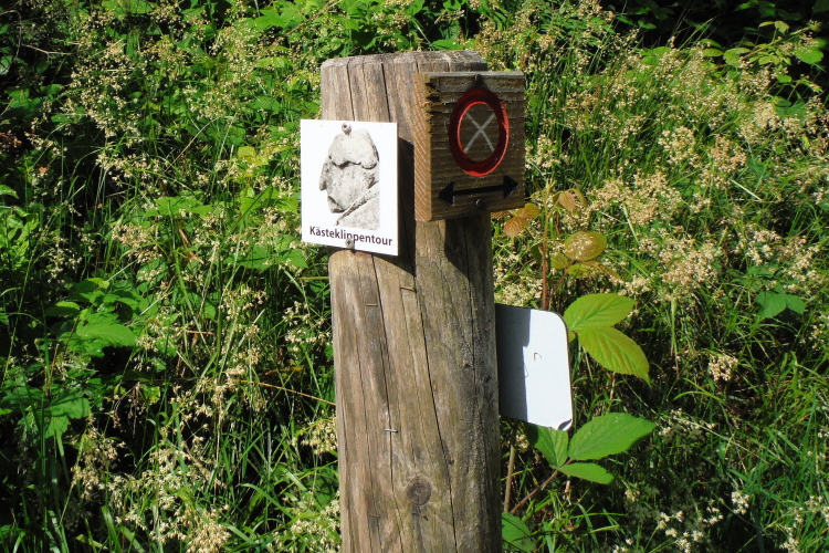 Derzeit bin ich mit Michaela alleine unterwegs. Die Unterhaltung hält an. Trotzdem ist es auf der zweiten Runde ruhiger. Wieder fällt mir die einzige feuchte Stelle auf der Wegstrecke auf. Diesmal erkenne ich sogar den Ursprung. Nicht der Regen tränkt den Boden, sondern die Bossequelle. Der untergestellte Topf kann das Wasser nicht halten, das sich unentwegt über und zeitweilig an der Strecke ergießt.