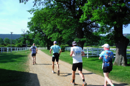 Viel wichtiger ist mir jedoch die Gelegenheit, nicht allein unterwegs zu sein. Mit Olaf, Ulrich und Michaela beginnen spannende Unterhaltungen, die bis ins Ziel anhalten werden. Wobei Michaela und ich zeitweise die anderen aus den Augen verlieren. Doch der Reihe nach. Auf dem Weg vom Gelände der Pferderennbahn erblicke ich die Berge, die ich in den nächsten Stunden erklimmen werde. Die Strecke führt schon leicht aufwärts. Nach etwas mehr als einem Kilometer erreiche ich die erste Verpflegungsstation. Hier geht es nach rechts in die erste Runde. Vorher trinke ich schon etwas, denn das kühle Nass werde ich heute noch nötig haben.
