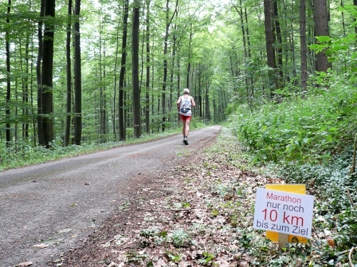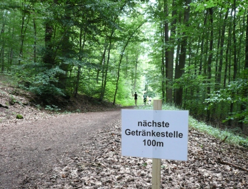 Km-Hinweise sind heute alle 5 Kilometer, nur die letzten 10 werden einzeln angezeigt. Kurz vor Km 5, wo der Philosophenweg auf die Bombergstrasse stößt, ist die erste Verpflegungsstation, die alles bietet, was der Läufer braucht, vor allem Wasser. Kurz danach geht es eine bergauf führende Asphaltstraße zur Kurklinik „Am Bomberg“.