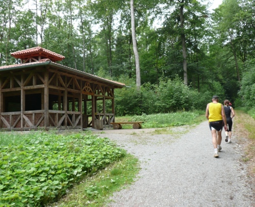 Kurz vor km 30 gibt es eine weitere VP-Station. Hier werde ich bereits vor dem nächsten Anstieg gewarnt, der zwar kurz, dafür aber sehr heftig ist und richtig weh tut. Dann der Hinweis: „Nur noch 10km“. Es geht westwärts und nochmal über die Fürstenhofschleife vorbei am Landhaus Stukenbrock zurück zur Bombergstrasse. Hier ist der letzte VP, der auch der erste war. Auf direktem Weg laufen wir zurück zur Stadt. Im Park merke ich erst so richtig, wie warm es heute ist. Wir kommen wieder am „Hylligen Born“ mit Wandelhalle vorbei und biegen in die Hauptallee ab.