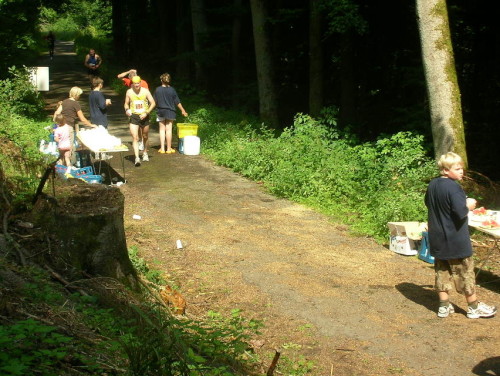 Bald laufe ich auf Markus auf und nach dem Abgleich unserer Zielzeiten (4:00 bis 4:15 Std.) mit ihm zusammen. Leider geht er mir bei km 15 verloren, da ich eine Steigung für ihn offensichtlich zu schnell nehme. Im Ziel konnte ich ihn auch nicht mehr entdecken. Melde Dich doch mal bei mir! Die (nicht vorhandene) HM-Marke überschreite bei ca. 2:00 Std., alles im Lot. Gut, daß ich regelmäßig in profiliertem Gelände trainiere... In etwa dort wird die zweite Runde angegangen, zumindest das kann ich identifizieren, ansonsten nehme ich alles, wie es gerade kommt. Ab km 25 laufe ich die nächsten 7 km völlig alleine. Spätestens hier werde ich, von einer weiblichen Ausnahme (Lady in Black, Respekt!) nicht mehr überholt. Ab km 37 kommen langsamere Läufer entgegen, die einige km zurückliegen. Ein beiderseitiges „Hi, Wolfgang!“ führt die m4y-Autoren für Sekunden wieder zusammen.