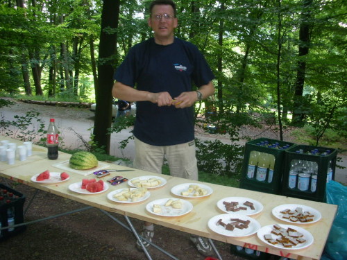 Elke versorgt mich mit Getränken. Nie zuvor habe ich nach einem Lauf derart viel getrunken, nein, gesoffen. Wasser, Iso, Brühe, bleifreies Weizen, alles, was flüssig ist - hinein. Nach etwa 20 Minuten habe ich mich so weit stabilisiert, daß ich zum Duschen ins Hotel gehen kann. Ein wenig schwummerig ist es mir noch den ganzen Abend. Nach dem Duschen gehen wir auf die „After-Race-Party“ und schlagen uns die Bäuche mit Nudelgerichten und Salat voll. Sehr schön ist, daß die Organisatoren die Zielzeit kurz entschlossen über 5:30 Std. hinaus ausdehnen. So kann Birgit ihren Bernhard endlich, noch offiziell gewertet, nach 5:32 Std. in die Arme schließen. Hört diese Aussage mit geradezu epochaler Tragweite: Bernhard verkündet, demnächst zumindest gelegentlich mit Uhr laufen zu wollen! Denn Reserven habe er noch gehabt. Ach ja: Lieber Joey Kelly und Heinz D....mann: der „Victory ist prima, wird in Zukunft öfter gekauft werden. Langsam klingt der Abend aus.