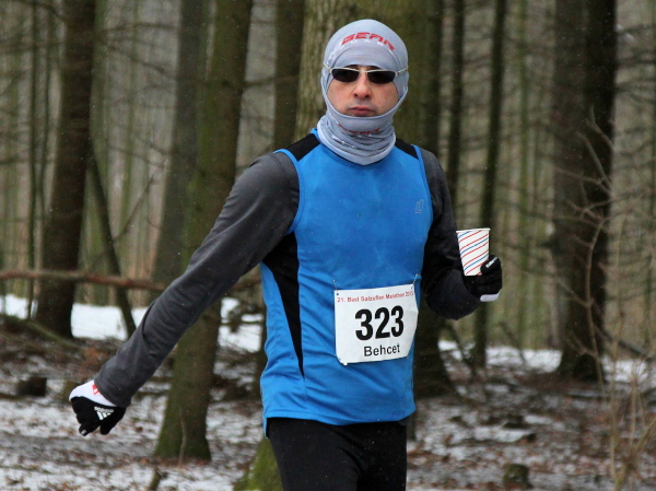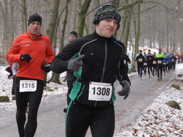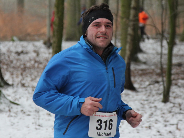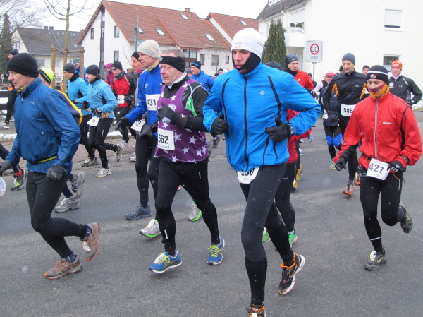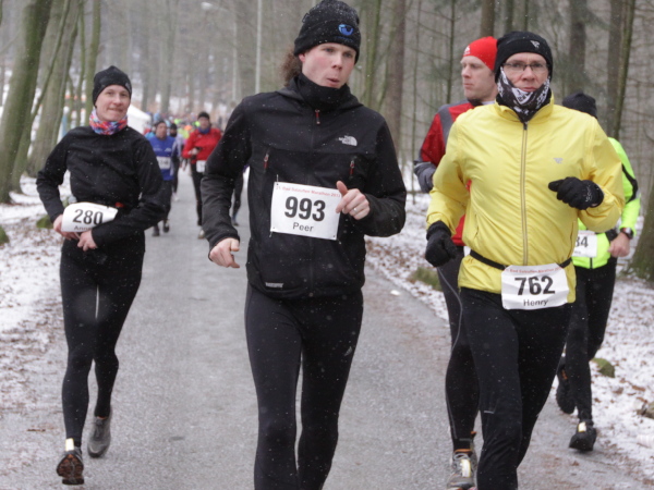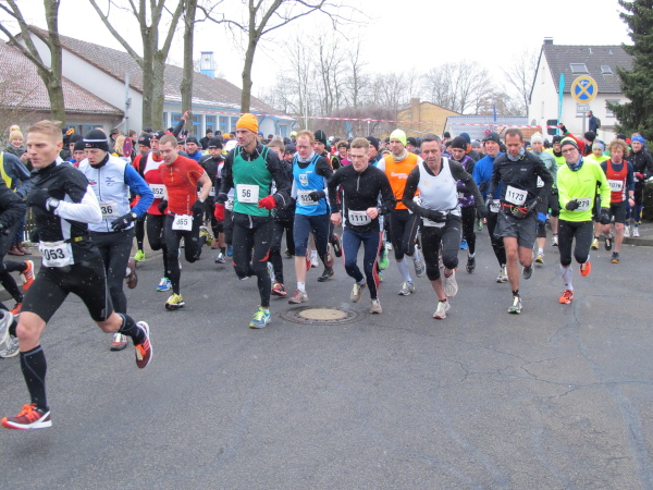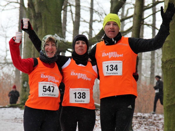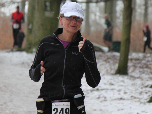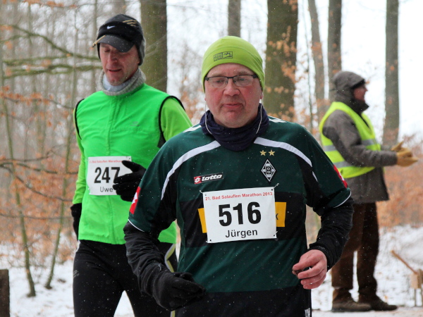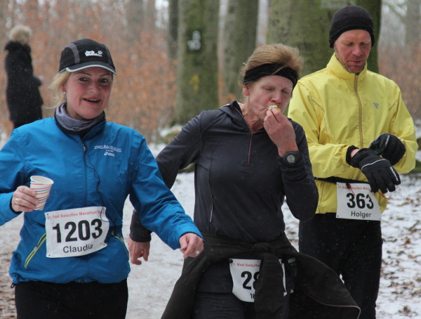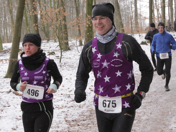 Ohne VanMan Jochen Heringhaus läuft hier keiner los. Bei Temperaturen um den Gefrierpunkt und durchgängig leichtem Schneeriesel ist er um seine Aufgabe nicht zu beneiden. Entsprechend ist sein Appell: „Liebe Freunde, 5 ½ Stunden habt ihr für den Marathon Zeit. Es ist Euch aber keiner böse, wenn Ihr alle schon nach 3 ½ Stunden zurück seid.“ Gerade mal vier Läufer tun ihm diesen Gefallen, das sei schon mal verraten. Und nur 143 Marathon-Finisher insgesamt wird es dieses Jahr geben.