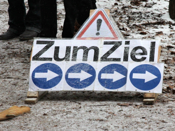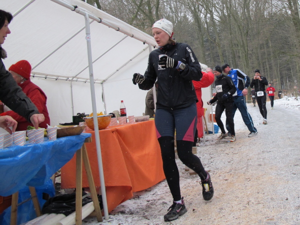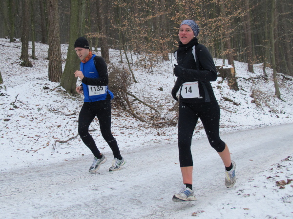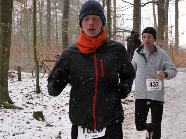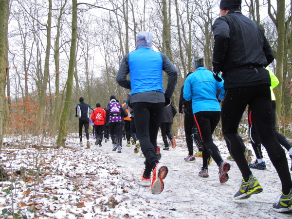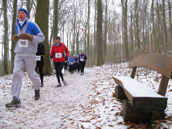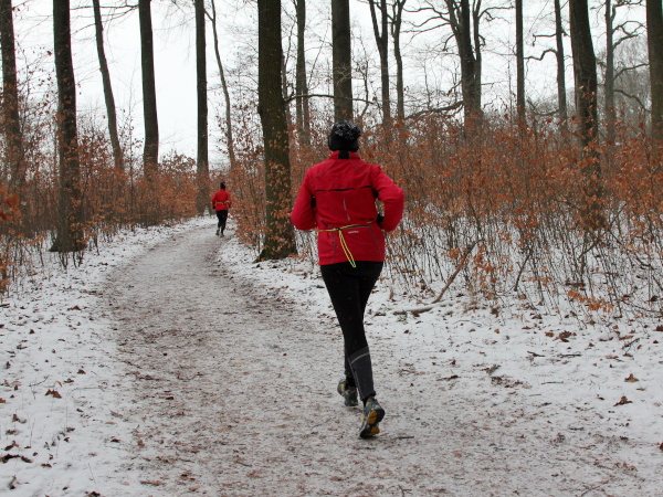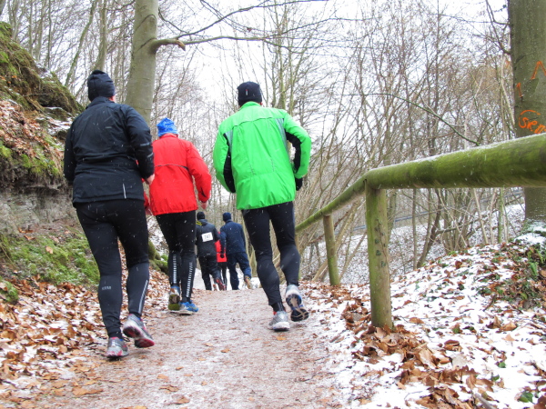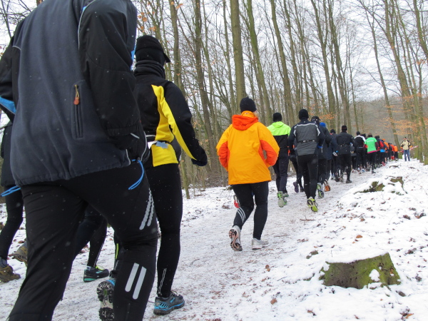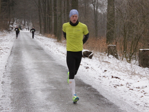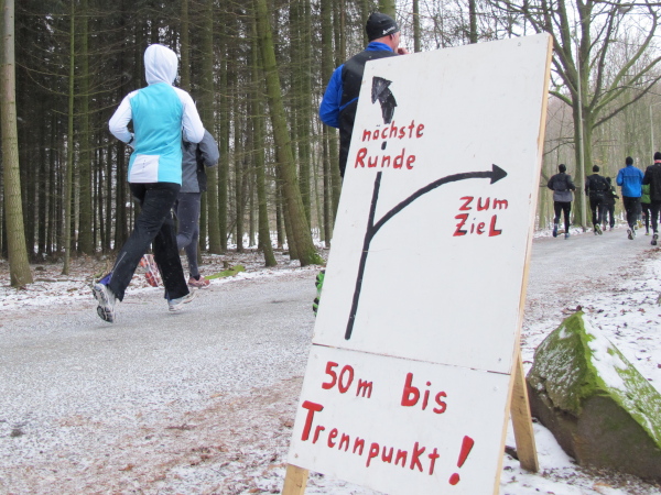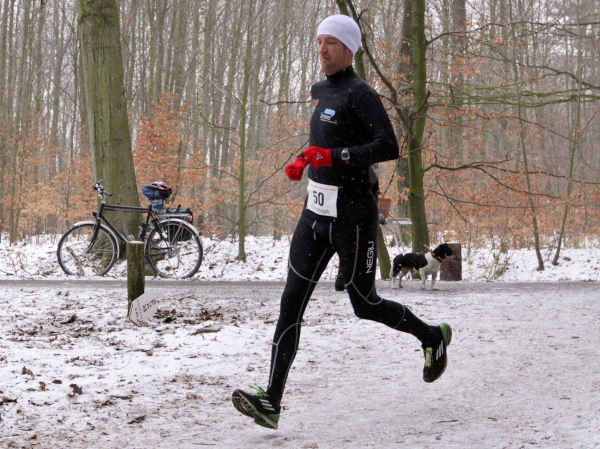 Die Kälte ist aus dem Körper, der Lauf ein Genuss. Trotz der Null Grad kann ich sogar auf die Handschuhe verzichten. Nur auf den Weg muss man höllisch aufpassen. In den Fahrspuren rechts und links ist es glatt, am besten läuft man im losen Laub in der Mitte oder am Wegrand. Vor der ersten Getränkestelle ist dick mit Sägemehl gestreut. Trotzdem haut es einen Kameraden genau dort auf den Allerwertesten, als er sich beide Hände am Teebecher wärmen und den Service loben will. Sofort wird Streugut nachgelegt, um weitere Unfälle zu verhindern.