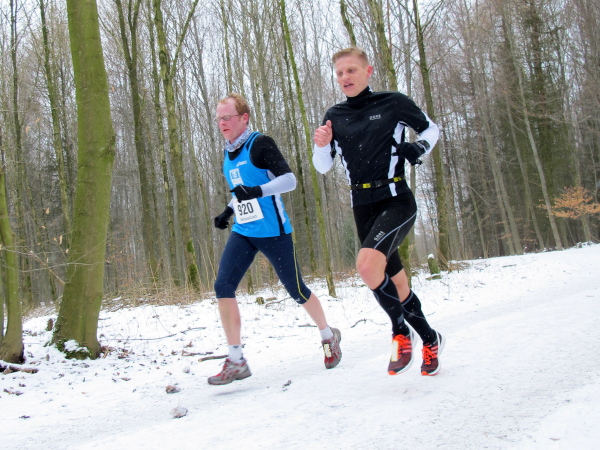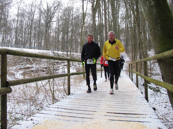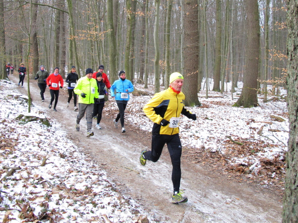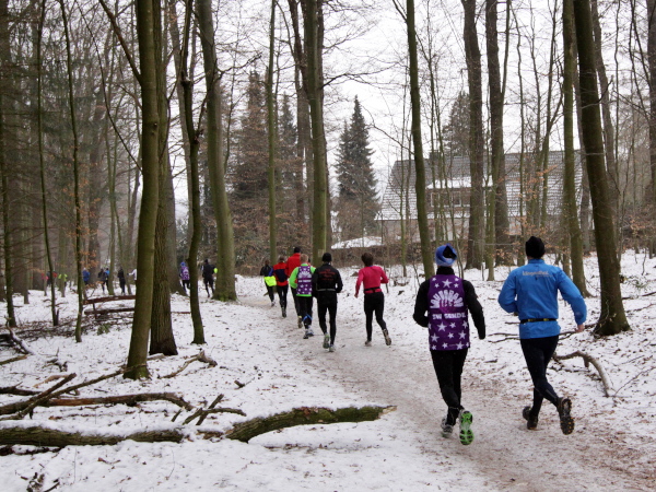 Auf dem leicht abschüssigen Waldweg könnte man jetzt locker Fahrt aufnehmen, wäre da nicht der spiegelglatte Untergrund. Schnee und Matsch sind knüppelhart gefroren und verwandeln die streckenweise bequemen Waldwege in anspruchsvolle Trails. Als lupenreiner Trailrun präsentiert sich der Kurs auch weiterhin, denn auf schmalem Pfad geht es parallel zur Verkehrsstraße weiter. Auf einer wackligen Holzbrücke wird ein Bach und kleines Sumpfgebiet überquert, es folgt die nächste kleine Steigung. Als ich den breiten Forstweg erreiche, ist das Läuferfeld fast so licht wie der Buchenwald.