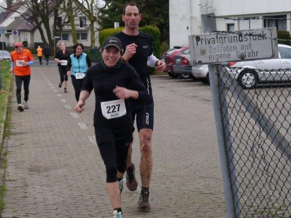 Die vierte Runde fängt an, wie die dritte aufgehört hat. Wir plauschen über unsere Laufabenteuer, rollen hinab und hinauf. Die Wege sind jetzt überschaubarer. Allein ist man aber nie und überrunden kann jetzt auch keiner mehr. Es geht auch immer ein Stück an der Autobahn 2 vorbei, da dringen gerade bergauf ein paar Abgase in die Lunge. Aber im dicht besiedelten NRW ist es gar nicht so einfach, Straßen bei Läufen auszuklammern. Gegen Rundenende merke ich, dass das Tempo von ca. 6min den km bei dem Höhenprofil und den Schlammwegen für mich zu hoch ist. Noch einmal lassen wir uns vom Streckenfotografen fotografieren, aber nach dem Verpflegungspunkt muss ich Jörg und Christian ziehen lassen.