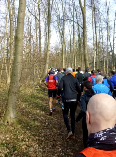 Die 200 10 km- Läufer sind schon weg. Es folgen die 1200, die sich was Längeres gönnen. Ergo: es knubbelt sich in den Kurven und an den Engstellen. Und erst recht an den Pfützen. Zum Wald hoch sind es ein km und 40 m Steigung. Erst dann beginnt die berühmte Runde. Das Gewühl entzerrt sich erst zum Ende des ersten Umlaufs.
