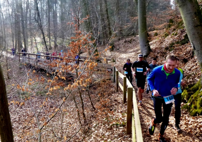 Becher in die Tonne und auf in die zweite Runde, diesmal aber deutlich entzerrter. Jeder hat so sein Tempo gefunden und kann nun ungestört vor sich hin traben. Eigentlich ist alles so wie vorhin, nur die Anstiege scheinen ein bisschen länger und auch steiler zu sein. Das steigert sich noch von Runde zu Runde. Dabei sind es immer die gleichen 125 m auf 8 km. Hier liegt sie, die Herausforderung! Immer im Wald, also im Schatten und ziemlich windgeschützt. Trotzdem – wer wird stärker sein: der Wille oder der innere Schweinehund?