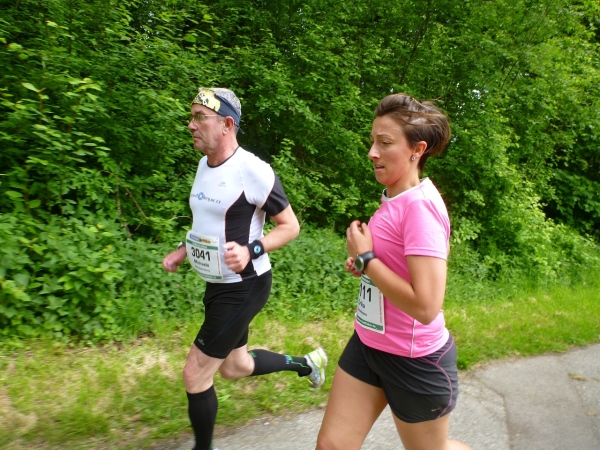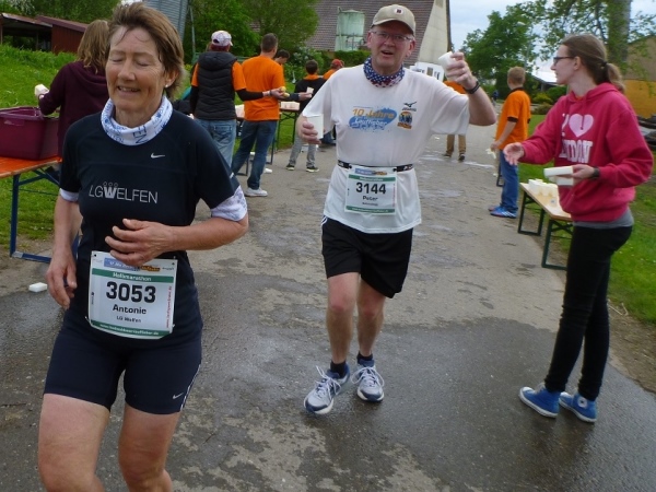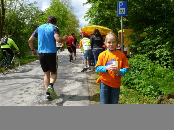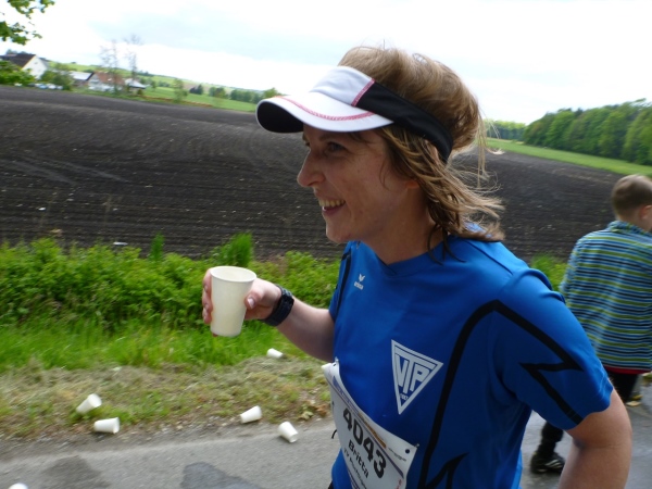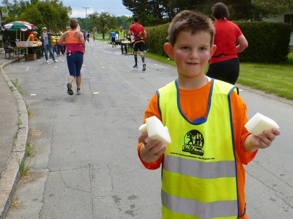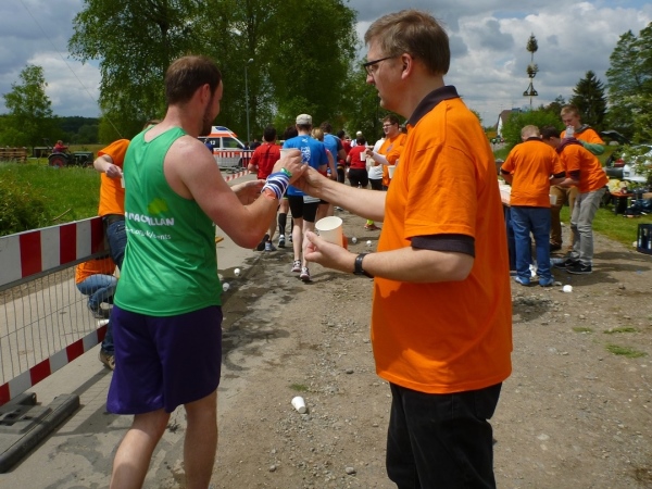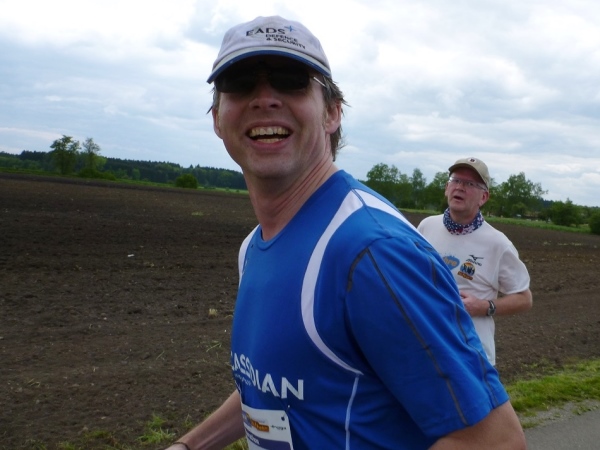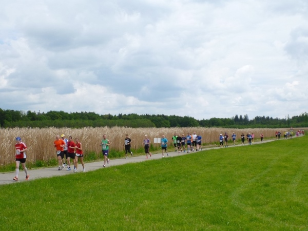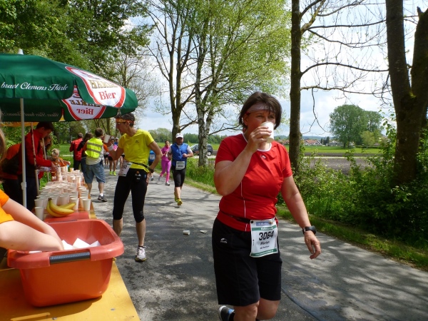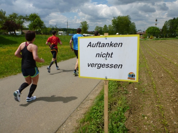 Auf gut fünf Kilometer Länge bemisst sich der folgende Begegnungsbereich. Der Schatten der Bäume würde auch bei Hitze mildernd wirken. Kilometer drei, erste Tankstelle mit Iso, Wasser und Bananen, wir greifen zu. Später wird noch Cola angeboten. Und wer Wasserschwämme braucht, auch dafür ist gesorgt. Etwa im Abstand von knappen drei Kilometern können diese Läufer-Reha-Einrichtungen angelaufen werden.