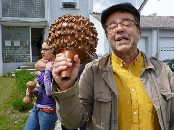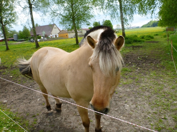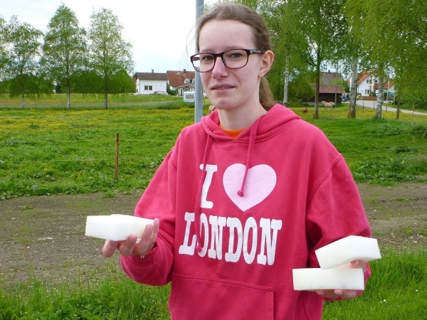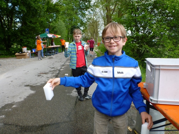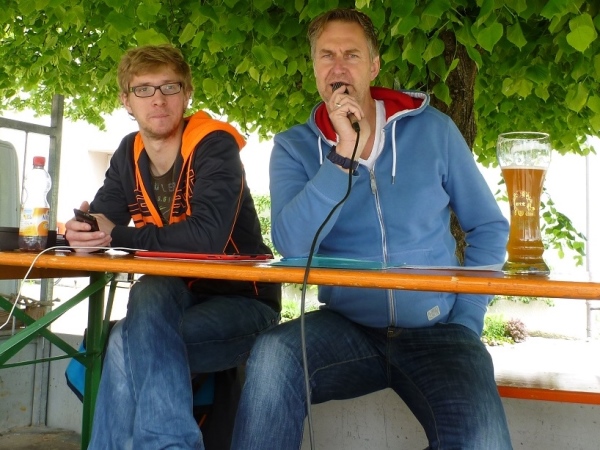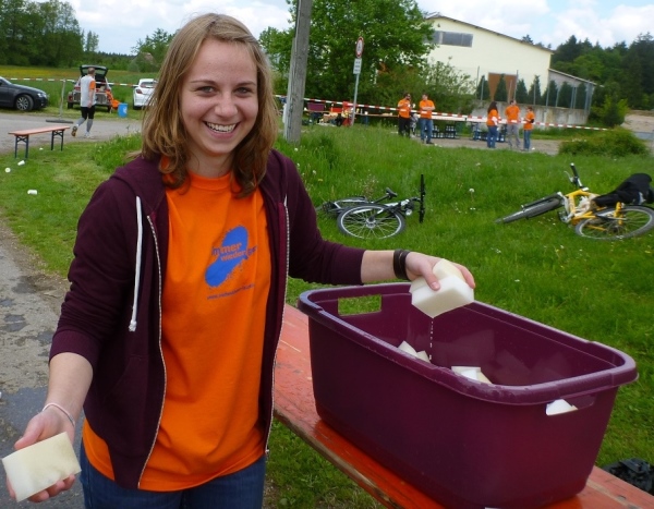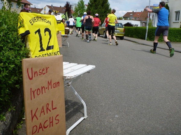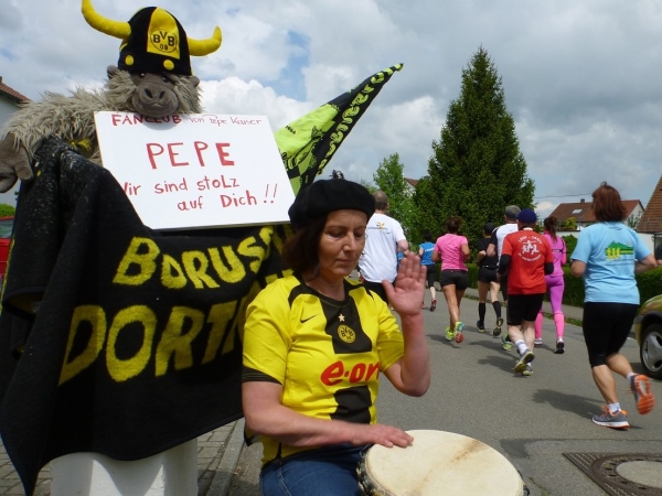Ein kleiner Abstecher führt uns durch den Ortsteil Steinach, wo das Zuschauerinteresse natürlich nicht so stark ist. Aber einige Anwohner machen dennoch Stimmung. Eine Familie hat sich mit Trommeln und Rasseln an der Strecke aufgestellt und macht uns Beine. Die Farbe gelb/schwarz dominiert an einem Grundstück, Fans der Borussia aus Dortmund. Schaun mer mal, wie das Pokalendspiel ausgehen wird. Vielleicht so: Die leben im Pott und wir haben den Pott.