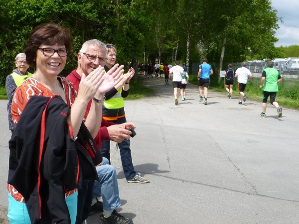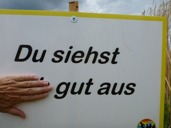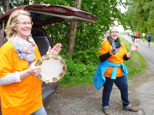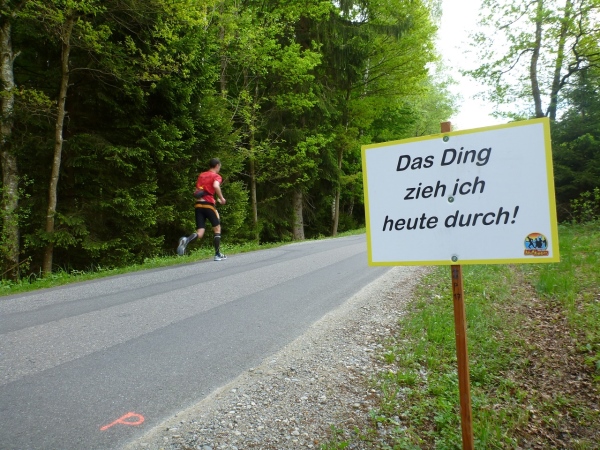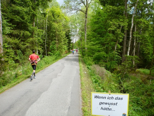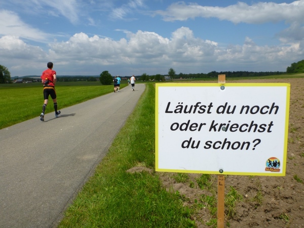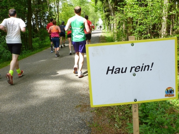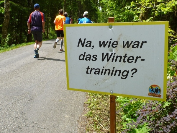 „Na, wie war das Wintertraining?“ lese ich auf einem Schild rechts des Weges. Eigentlich doch gut, oder? „Hau rein!“ ist der nächste Hinweis. Weitere Schilder für unsere Auflockerung folgen auf diesem Stück durch das Steinacher Ried. Am Ende des Waldes machen zwei Frauen emsig Stimmung mit Musik aus der Konserve und mit Tamburins. Und das Gute daran, die haben Ausdauer bis der letzte Marathoni auf dem Heimweg ist.