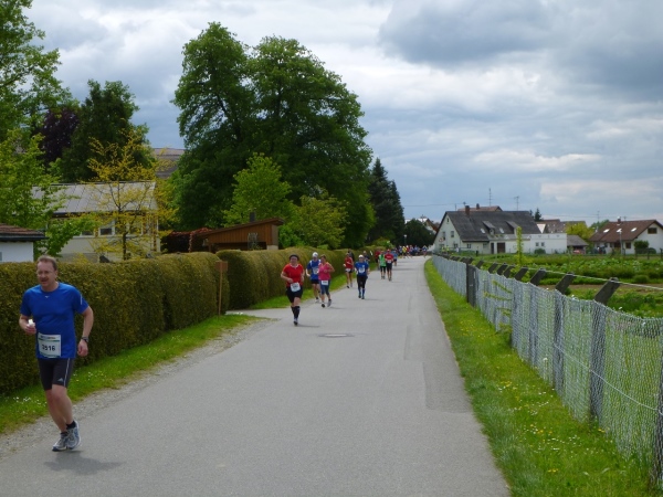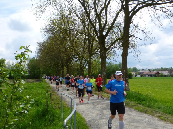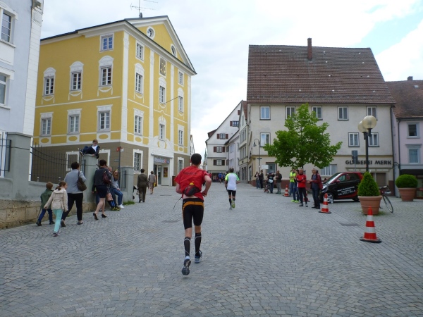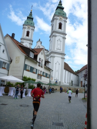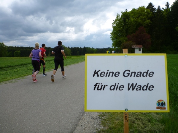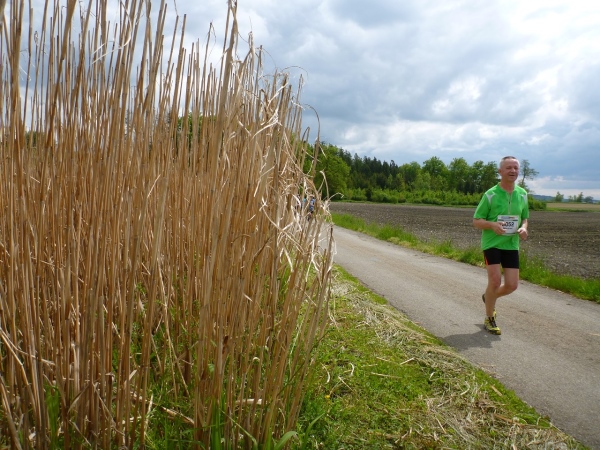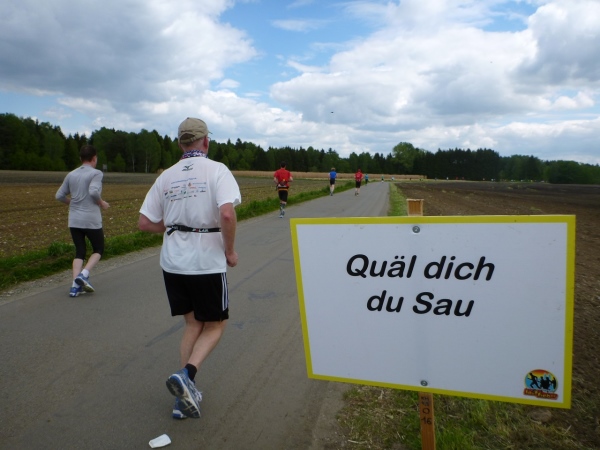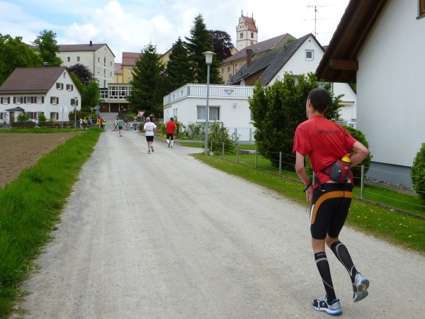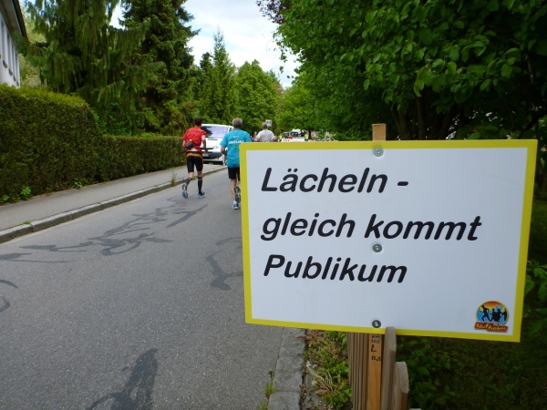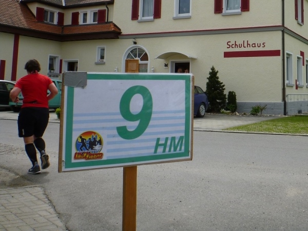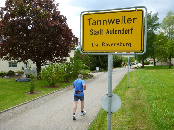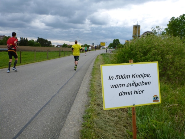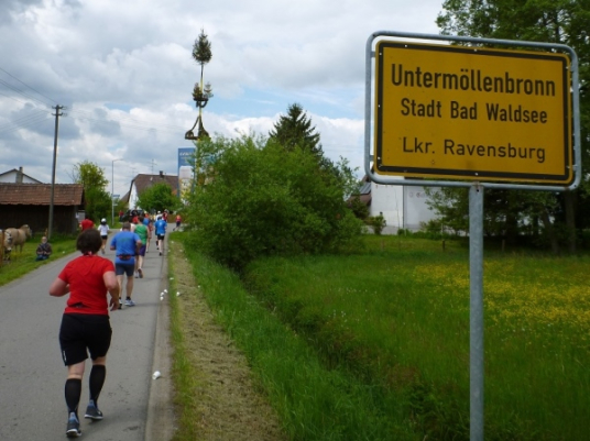 „In 500 Meter Kneipe, wenn aufgeben, dann hier,“ ist am Ortseingang zu lesen. Ich werde aufmerksam, eventuell fällt für mich etwas ab. In Reute dürfen wir einen kleinen Gegenverkehrsbereich belaufen, dann gibt es eine Schleife am Dorfplatz. Schule, Maibaum, Moderation, Bierbänke, aber kein Freibier. Ich glaube, auf der zweiten Runde werde ich beim Moderator betteln gehen, denn er ist gut mit einem Weizen versorgt.