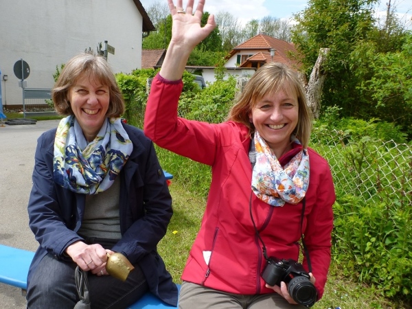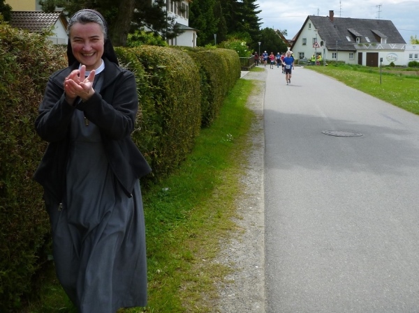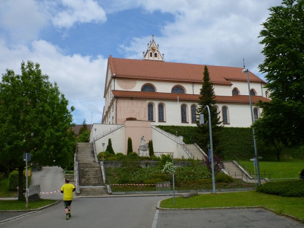 Am Schulhaus in Tannweiler haben wir schon neun Kilometer hinter uns gebracht. An der Absperrung stehen zwei Polizisten, die uns zuwinken. Nach weiteren zwei Kilometern verlassen wir ein Waldstück und in der Ferne sehen wir den Stadtteil Reute. Das Ortsbild prägen die Bauten des Franziskanerinnenklosters. Elisabeth Achler war eine der fünf Gründerinnen im Jahr 1403, man nennt sie heute auch Gute Beth.