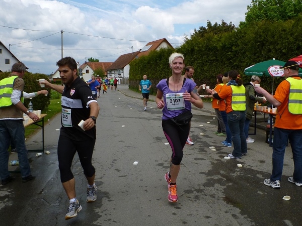 In Möllenbronn beginnt die etwa 7,5 Kilometer lange Schleife über Möllenbronn, Tannweiler und Reute. Am Beginn heißt es noch „Auftanken nicht vergessen“. Sehr positiv fällt mir die Betreuung an den Tankstellen auf. Viele Helfer und Kinder, die dir Becher, Schwämme und Bananen zureichen. Ich glaube, die würden dir das Wasser auch noch einen Kilometer hinterhertragen.