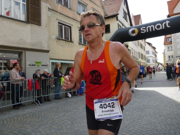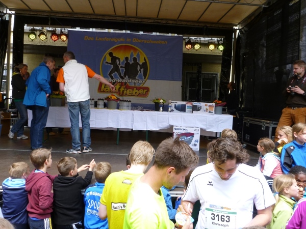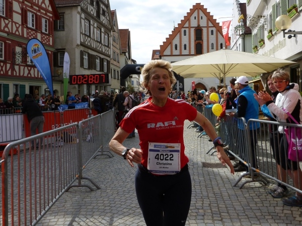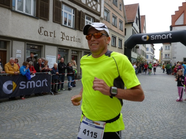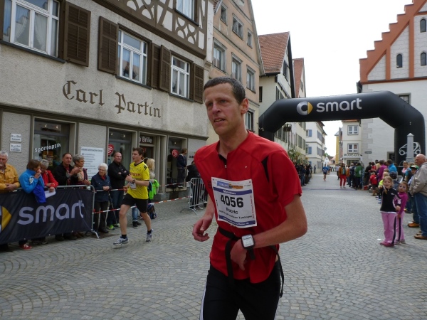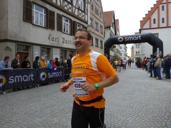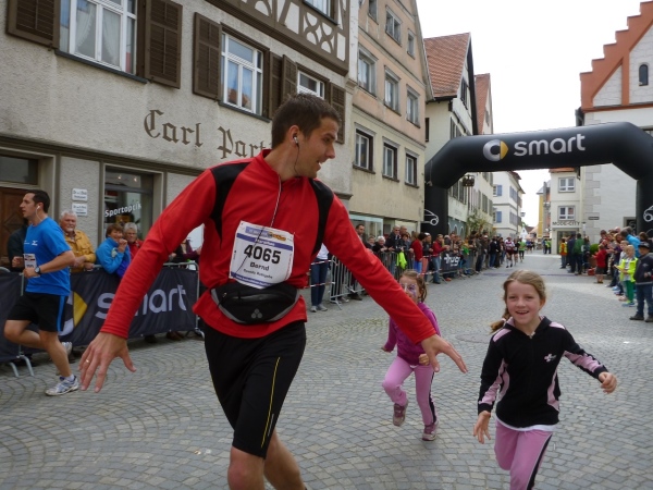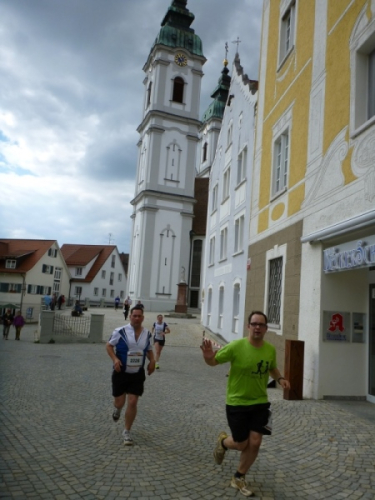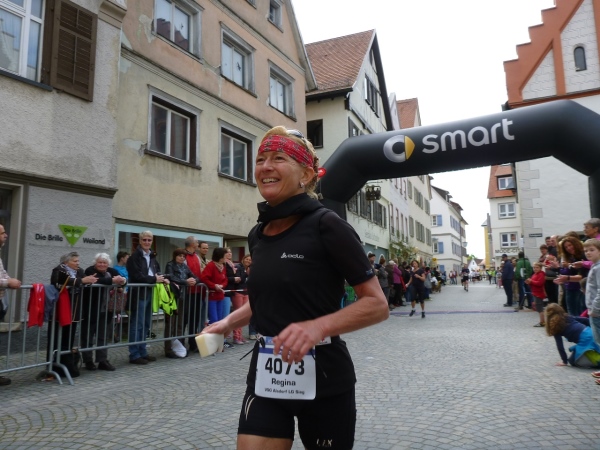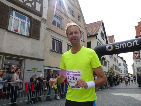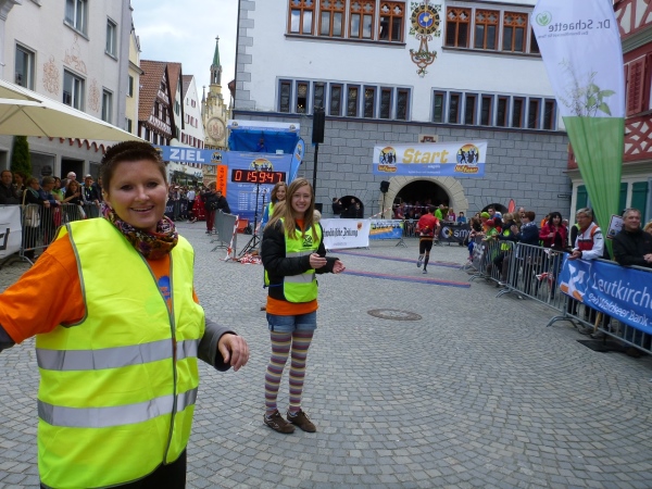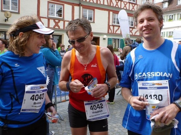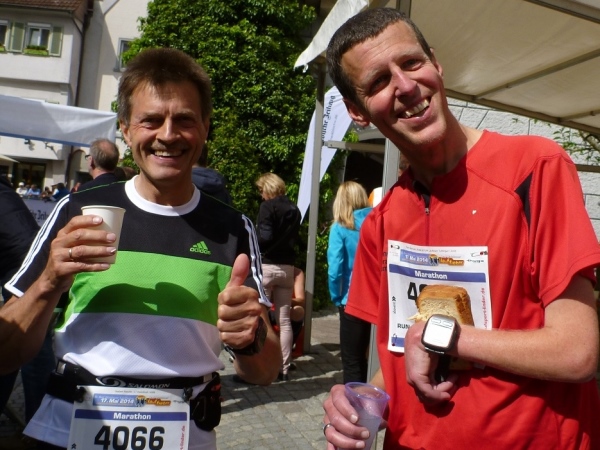 Bei der letzten Tankstelle brauche ich nur eine Handbewegung machen und schon wird uns das flüssige Hopfengold serviert. Wir bedanken uns für die Gabe und gehen die letzten drei Kilometer an. Zwar wirkt der Alkohol kurzfristig in Hirn und Bein, doch nach der Schleife um das Stadtschloss hören wir schon den Moderator am Rathaus. Glücklich laufen wir Seite an Seite unter dem Zielbanner durch. Zwar haben wir die vier Stunden nicht mehr unterbieten können, dafür sind wir aber restlos infiziert vom Bad Waldsee Lauffieber.