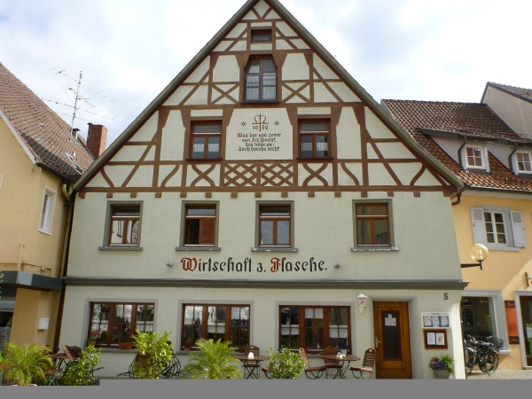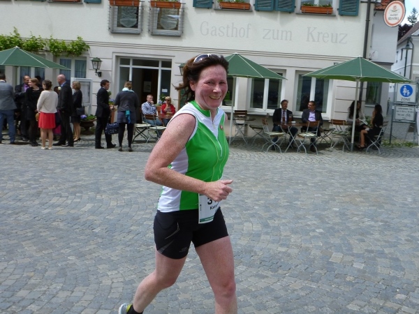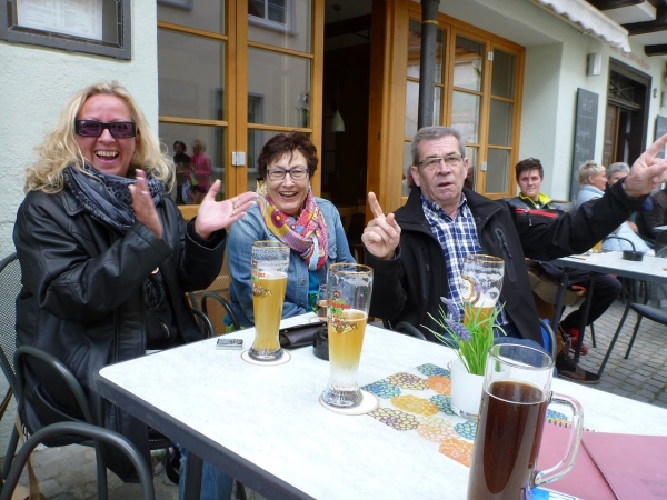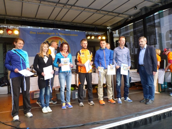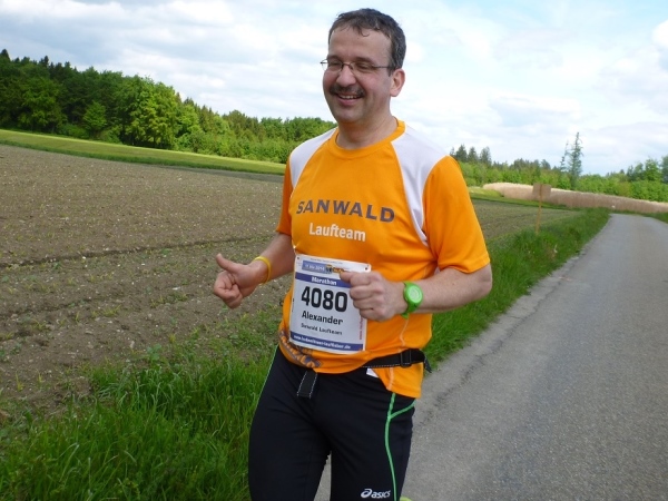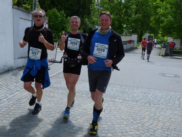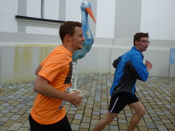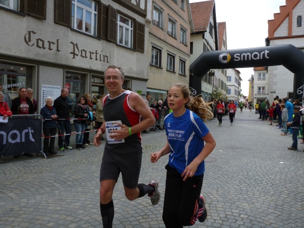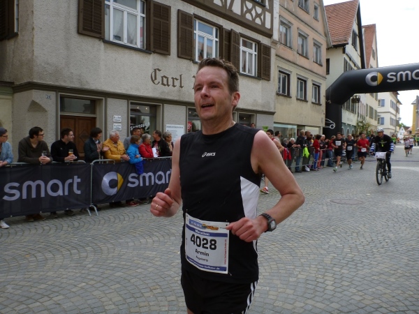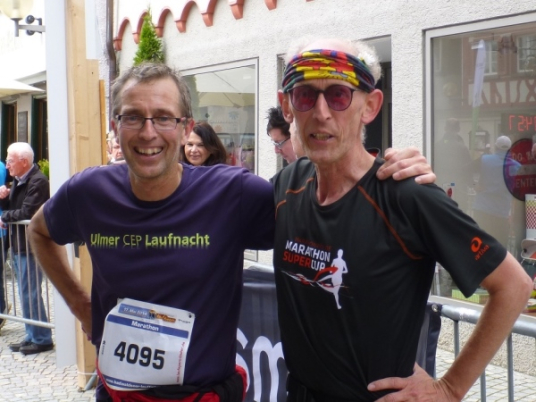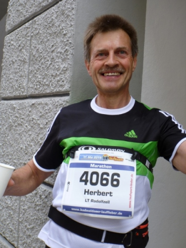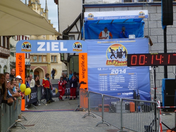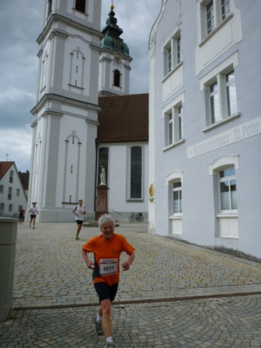 Bei der letzten Tankstelle brauche ich nur eine Handbewegung machen und schon wird uns das flüssige Hopfengold serviert. Wir bedanken uns für die Gabe und gehen die letzten drei Kilometer an. Zwar wirkt der Alkohol kurzfristig in Hirn und Bein, doch nach der Schleife um das Stadtschloss hören wir schon den Moderator am Rathaus. Glücklich laufen wir Seite an Seite unter dem Zielbanner durch. Zwar haben wir die vier Stunden nicht mehr unterbieten können, dafür sind wir aber restlos infiziert vom Bad Waldsee Lauffieber.