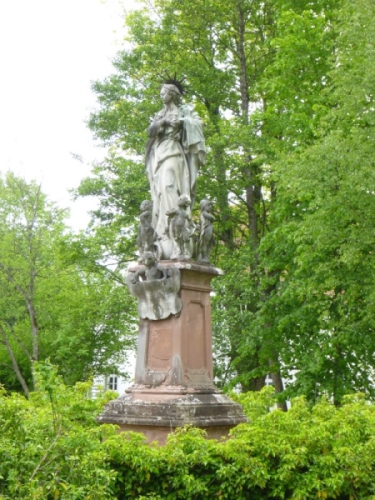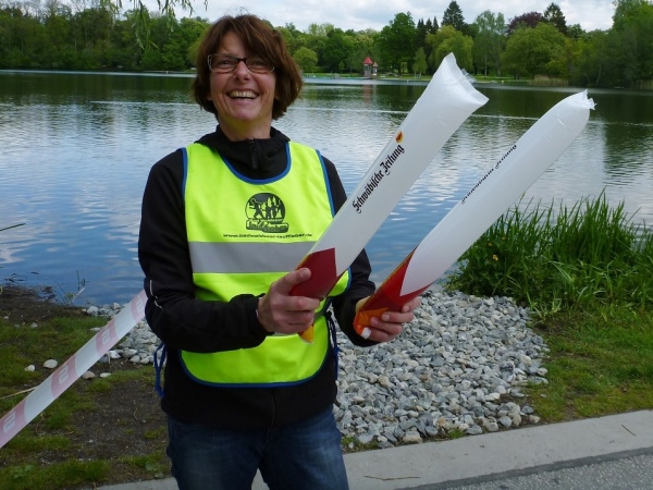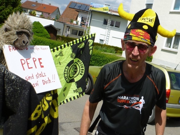 Das hintere Halbmarathonfeld kommt uns auf dem Gelände des Schlosses entgegen. Im Schlosshof hingegen kriegt einer lebenslänglich, denn der ist heute verheiratet worden. Die Dortmund-Fans haben sich mittlerweile verzogen, die Fan-Artikel stehen jedoch noch an der Strecke. Mich juckt der Schalk, setze die BVB-Kappe auf und lasse mich fotografieren. Unser Chefredakteur wird bei diesem Bild hoffentlich ein Auge zudrücken und nicht die „Löschen“-Taste nutzen.