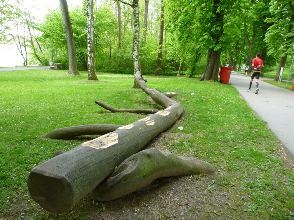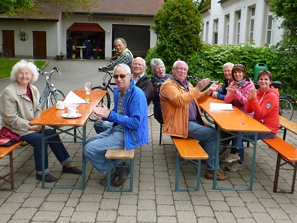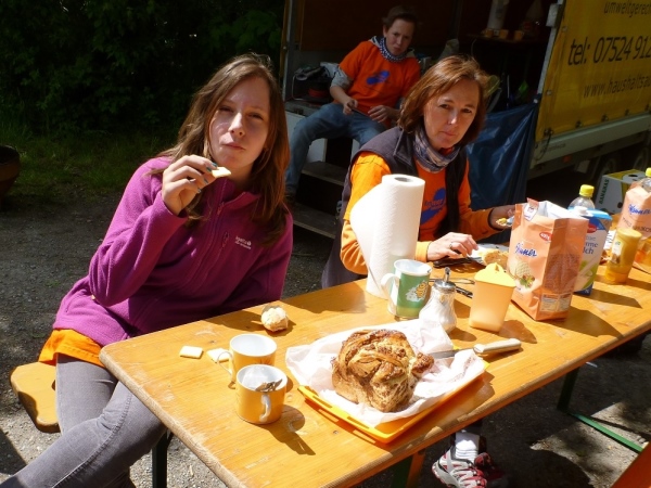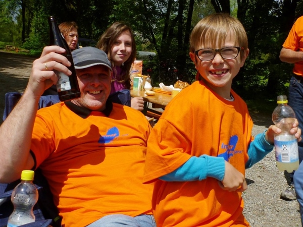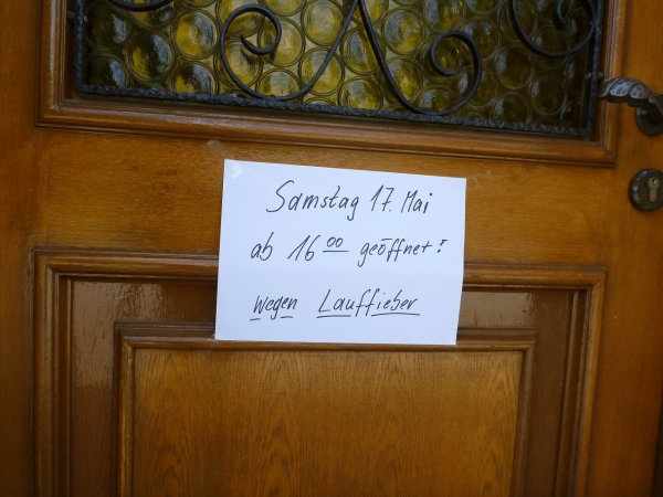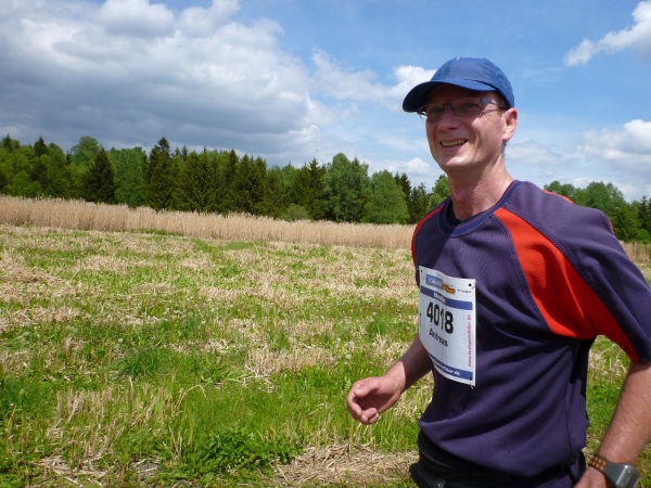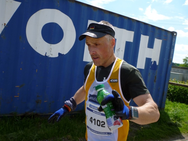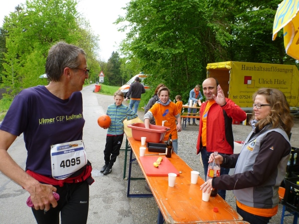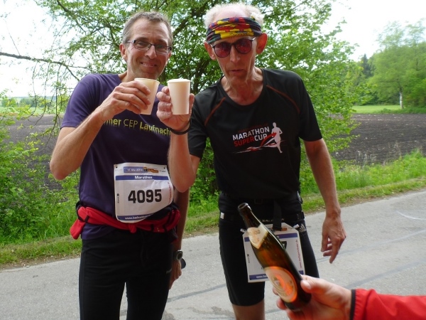 Auf der folgenden V-Stelle ist die meiste Arbeit getan, denn zur weiteren Versorgung der Läufer reichen zwei Leute. Das übrige Personal hat es sich mit Kaffee, Nusszopf und Waffeln gemütlich gemacht. Kurzzeitig bekommt ein Helfer wegen mir zusätzlich zu tun, denn ich frage nach etwas „Gescheitem“ zum Trinken und er präsentiert mir nach einiger Rödelei einen Becher kühlen Gerstensaftes. „Bier saufa und Marathon laufe, i kanns net glaube“, staunt er, während er mir nachschenkt. Ich kündige beim Weiterlaufen eine weitere Einkehr auf dem Rückweg an.