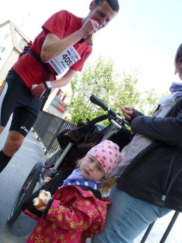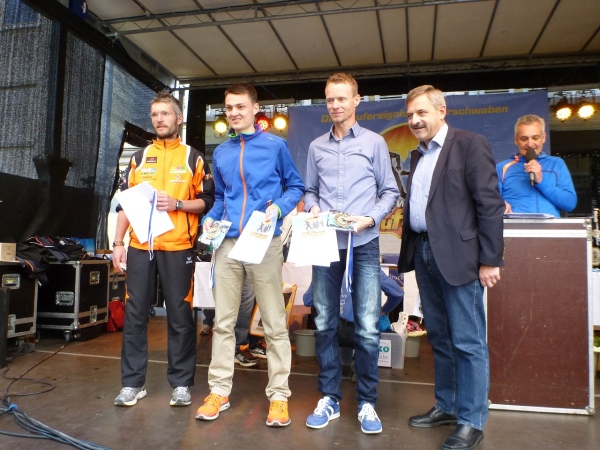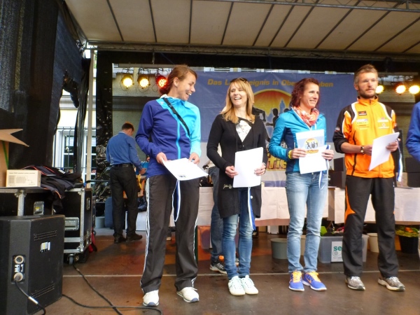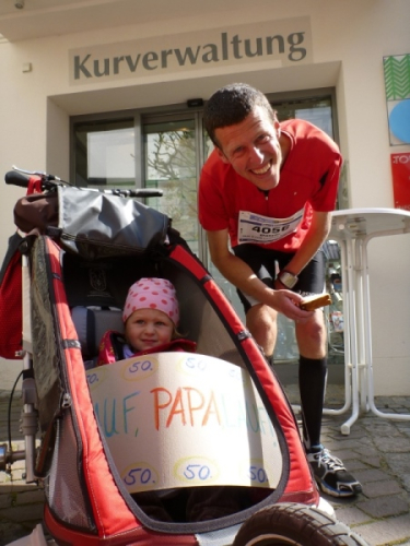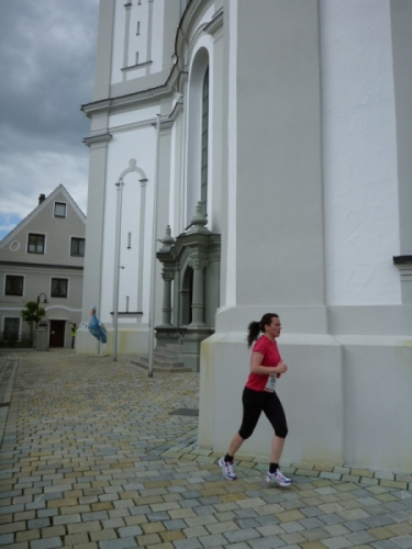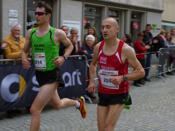 In Richtung Moderation winkend höre ich, wie man mich vorstellt und was mein Job heute ist. Beim letzten Satz renne ich schon an der Bühne auf der Hochstatt vorbei, wo gerade die Siegerehrung der Nachwuchsläufer beginnt. Die Strecke wird nun sehr übersichtlich, denn die knapp 500 Halbmarathonläufer fehlen auf der zweiten Runde. Also gehört die Strecke den rund 100 gestarteten Marathonis alleine.