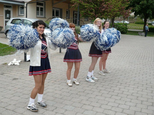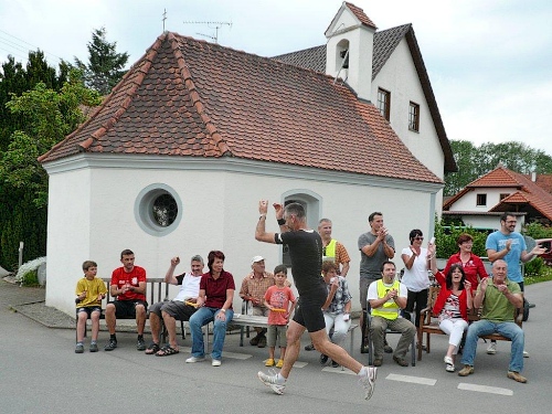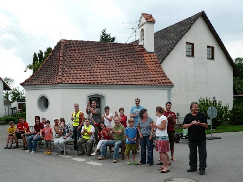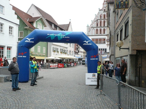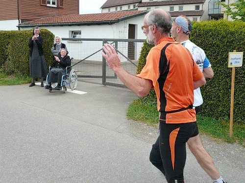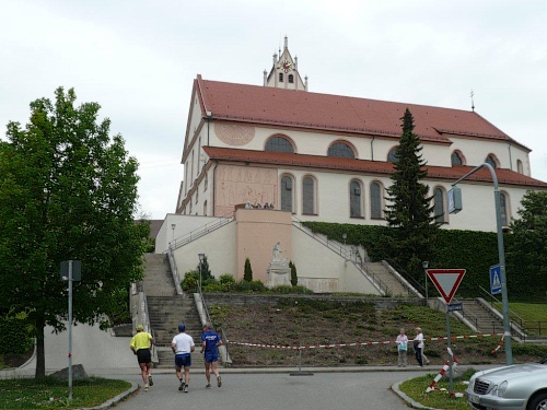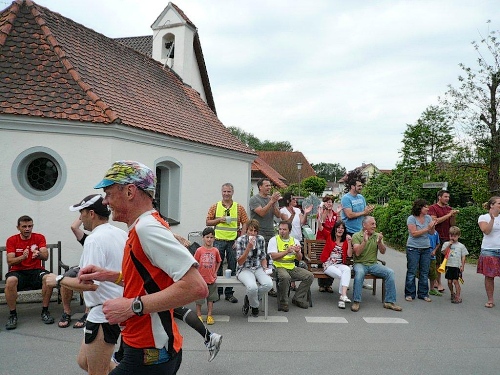 Im Dorf gibt es eine Wendeschleife über den Dorfplatz. Dass die Läufer angefeuert werden, dafür sorgen Cheergirls, ein Radiokommentator und ein musikalisches Rahmenprogramm. Mit dem eben live gespielten Song „Hit he Road Jack“ auf den Lippen tue ich - wie es Jack geheißen wurde - und ziehe wieder nordwärts. Dabei sehe ich Peter und Paul aus der Nähe, die Pfarr- und Wallfahrtskirche, welche das Grab der Seligen Elisabeth von Reute beherbergt.