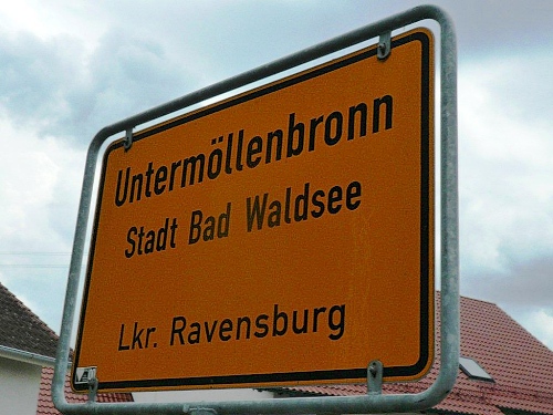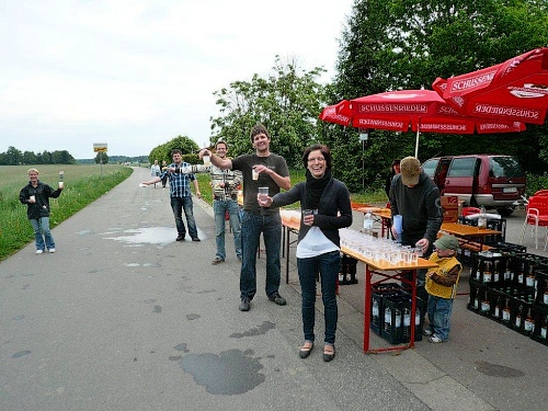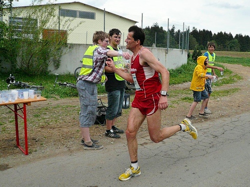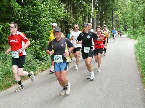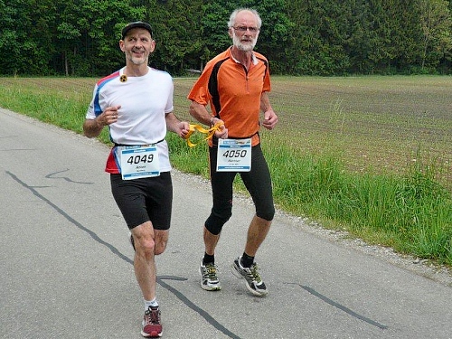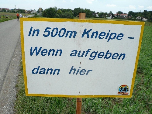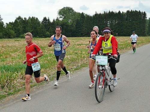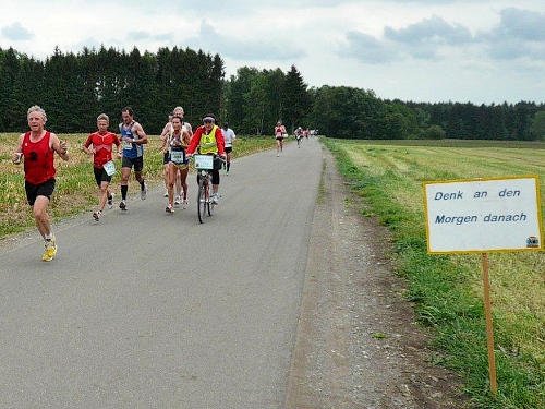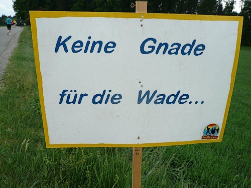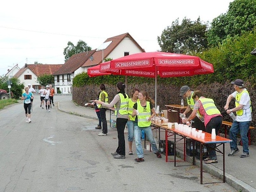 Die Straße durch Obermöllenbronn beschreibt ein S und mündet im rechten Winkel auf die Straße ein, auf welcher wir von Osten her gekommen sind. So, wie wir in der Gegenrichtung erfrischt und gestärkt wurden, so wird es uns auch in dieser Richtung angeboten. Auch für weitere Abwechslung ist gesorgt. Ich bekomme nämlich gerade die Spitze des Halbmarathons zu sehen. Damit ist auch auf den kommenden Kilometern zurück nach Bad Waldsee für Kurzweile gesorgt, bis ich den Schluss des Feldes gekreuzt habe, was doch ein Weilchen dauert. Das Feld ist eindeutig imposanter als die kleine Marathonequipe, zudem macht es den Anschein, dass der Frauenanteil bei „den Halben“ einiges höher ist. Gut, bei der Quote im Marathon ist das noch schnell erreicht…