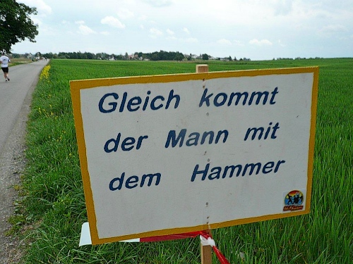 Nach dem Wohngebiet stehen auf der rechten Seite viele Brummis bereit, beladen mit Wohnmobilen des ortsansässigen renommierten Herstellers und wichtigen Arbeitsgebers der Region, Hymer. Ich träume davon, dass irgendwann ein solcher Truck vor meiner Haustüre hält und mir ein kleines, rollendes Daheim ausliefert, mit dem ich von Marathon zu Marathon tuckern kann…