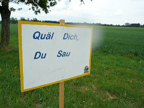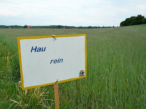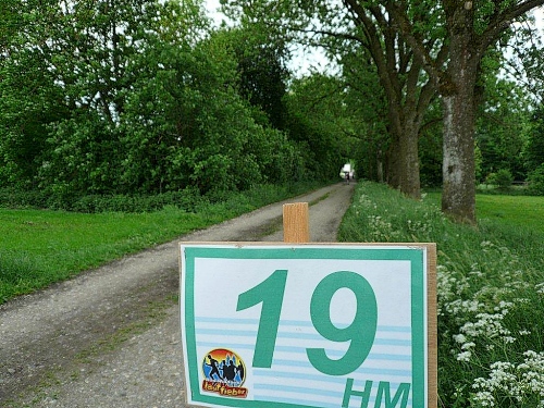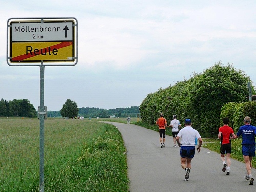 Auf einer schmalen, langen und ziemlich geraden Straße geht es durch den Wald des Steinacher Rieds. Das Moor mit den Torfabbaufeldern entzieht sich auch nach dem Verlassen des Waldes unseren Blicken, eine Zeile Bäume am Rand der Felder verbirgt es. Dafür kommt schon bald wieder ein Verpflegungsposten mit fröhlichen, motivierten Helfern in Sicht. Links liegt der Weiler Obermöllenbronn, einen Steinwurf voraus– für geübte Demonstranten einen halben – liegt das Ortsschild des östlichen Endes von Untermöllenbronn. Statt in die Ortschaft hineinzulaufen, biegen wir rechts ab und kommen an Pferden und neugierigen Eseln auf ihren Koppeln vorbei. Auch der Untergrund präsentiert sich vorübergehend der Szenerie noch angepasster, nämlich asphaltfrei. Wobei, dadurch dass fast die ganze Strecke asphaltiert ist, braucht es weniger Konzentration, um sturzfrei die friedliche Landschaft zu genießen.