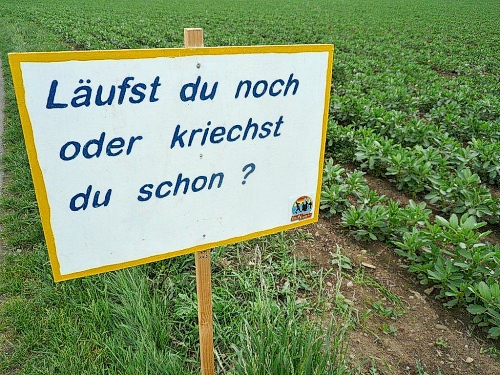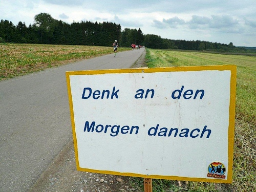 „Gegenwind formt den Charakter“ steht auf einem der regelmäßig auftauchenden Schilder am Wegrand. Mit dem leichten Lüftchen, welches uns umweht, haben wir ein leichtes Spiel, denn im Zusammenspiel mit der zunehmenden Bewölkung verhilft es zu perfekten äußeren Bedingungen. Das leicht wogende, satte Grün des Getreidefeldes neben der Straße strahlt eine tiefe Ruhe aus. Recht ruhig ist es auch im Marathonfeld. Es hat sich zwar auseinandergezogen, es sind aber genügend Läufer in der Nähe um mitzubekommen, dass in der nächsten Ortschaft Tannweiler diese Ruhe auf angenehme Art unterbrochen wird. Besonders bei der Kapelle an der Hauptkreuzung werden sie lautstark angefeuert. (Dass ich mit der Kamera die Aufmerksamkeit auf mich ziehe, bin ich gewohnt…)