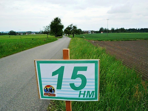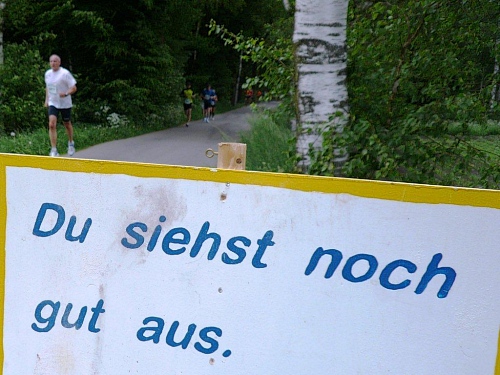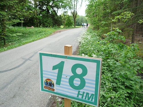 Nach diesem Stückchen Industrie geht es hinaus ins Grüne, ein kürzerer Abschnitt ist nun auch nicht mehr asphaltiert. Nachdem schon nach einem Kilometer das erste Mal Getränke gereicht wurden, gibt es nach 4,5km schon wieder Verpflegung. Verdursten und verhungern muss niemand, die Abstände zwischen den einzelnen Labstellen sind immer etwa gleich kurz. Wenn jemand nebst Wasser, Apfelschorle und Bananen etwas anderes braucht, um über die Runden zu kommen, dann tut er gut daran, sich entsprechend zu organisieren. Ich komme so zurecht.