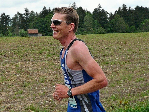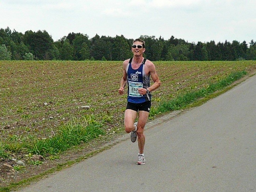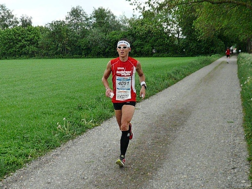 Kurz vor dem Kilometerschild 19 kommt mir Steffen Wittmann auf dem Weg zu seinem Marathonsieg entgegen. Da läuft was!