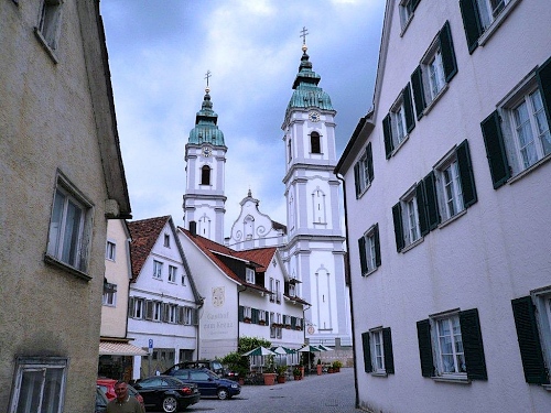Auf der rechten Seite ist die Stiftskirche St. Peter zu sehen, deren Doppeltürme als Wahrzeichen der Stadt über ihre Dachlinie thronen. Ihre barocke Erscheinung entspricht der Vorliebe zum Zeitpunkt ihres Baus vor bald 250 Jahren, als die alte gotische Kirche vergrößert wurde. Auf der anderen Seite des Pflasters steht der hundertjährige Gut-Betha-Brunnen, errichtet zu Ehren der Waldseerin Elisabeth Achler, „die selige Gute Beth“ genannt. Das Franziskanerinnenkloster in Reute, an welchem wir später vorbeilaufen werden, wurde eigens für sie und weitere Nonnen anfangs 15. Jahrhunderts erbaut. Bald nach dem frühen Tod der Mystikerin wurde die gute Beth als Wundertäterin verehrt und zweihundert Jahre später selig gesprochen.