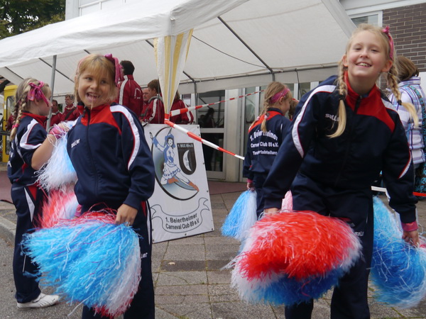 Km 26,  vorbei ist es mit der Landschafts-Idylle, wir sind am Rheinhafen. Vor uns steht das Heizkraftwerk. Schon seit 1951 versorgt es die Karlsruher mit Fernwärme versorgt. Das Bauwerk ist ein gutes Beispiel, dass Industriebauten nicht hässlich sein müssen. Ausgesprochen hübsch sind die Nachwuchstänzerinnen vom TSC Rheinstetten, die hier ihr Können zeigen. Ihre Kolleginnen in Mühlburg (km 27) kommen uns orientalisch.