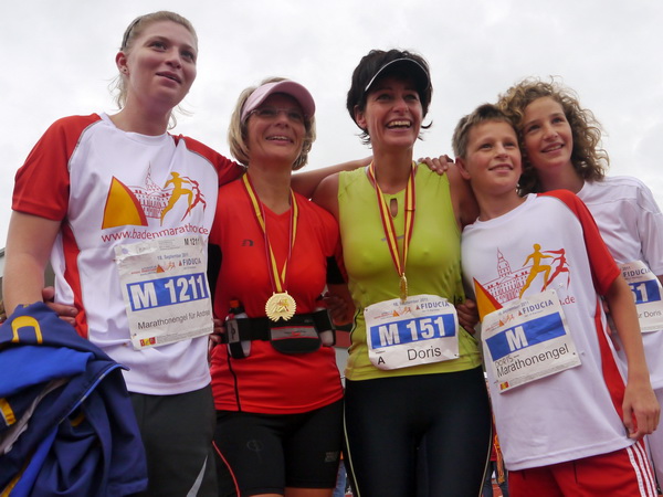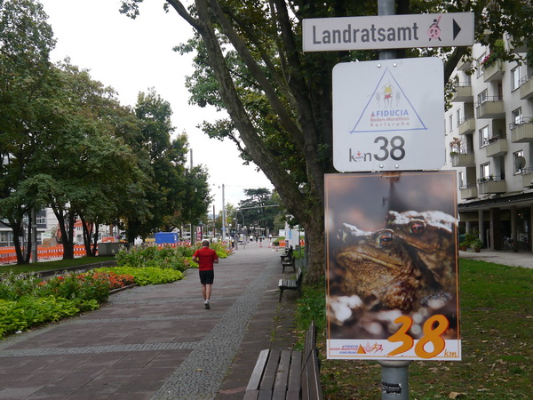 km 37 ist „Engele flieg Zone“. Hier warten die sogenannten Marathon-Engel auf ihre Helden, um sie ins Ziel zu begleiten. Es ist ja zur weit verbreiteten Unsitte geworden, dass man nach 10, 21 oder 42 km nicht mehr alleine ins Ziel läuft, sondern sich von der Familie begleiten lässt. In Karlsruhe hat man damit auf ganz charmante Art aufgeräumt. Jeder Läufer ab einer Zielzeit von 3:45 kann sich von 1 bis 3 Engeln begleiten lassen, die sich mit einer  Art Startnummer als solche ausweisen. Ohne kommt niemand in den Zielraum.