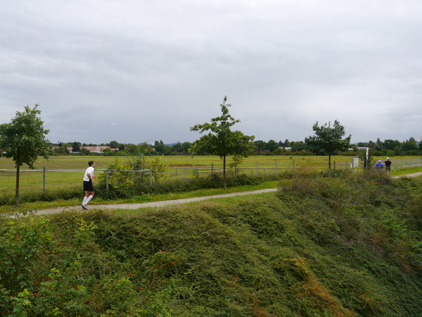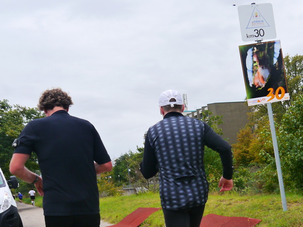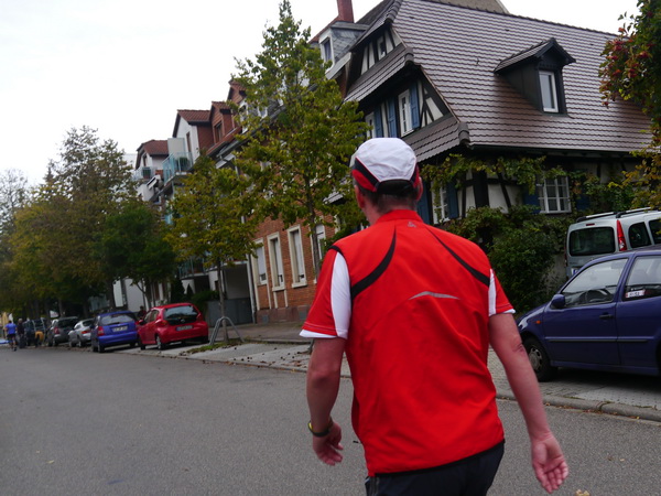 Nordweststadt, St. Konrad-Kirche (km 29),  Verpflegungsstelle und Gartenfest. Weiter geht es zum alten Flugplatz (km 30). Die nächste Brücke bringt uns über den Adenauerring. Simon geht rückwärts hoch – der Kampf mit dem Krampf. Aber er hält durch. Der KSC auch? Zum Wildparkstadion ist es nicht weit.