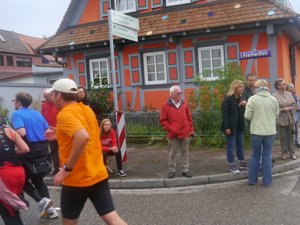 Der Weg nach Bulach führt zunächst über freies Feld, wo mich Friedbert und Heiko, die 4:30 Pacer einholen. Friedbert muss ein ganz großer m4y-Fan sein, denn er hat sich in alter Karlsruher Body-Painting-Tradition ganz orange eingefärbt. Zum Glück bleibt es trocken. Oder ist die Farbe wasserfest? Über den Belchenplatz erreichen wir ein kleines Waldstück, Gut Scheibenhardt (das Jagdschloss sieht man nicht, es liegt auf der anderen Straßenseite) und schließlich Bulach (km 18), über dessen Eingemeindung man sich 1929 in Karlsruhe sehr freute. Bulach war eine wohlhabende Landgemeinde, der man bis dahin manches Gelände für teures Geld abkaufen musste.