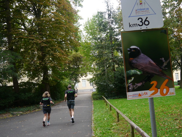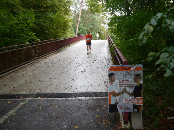 Gleich nach km 10 laufen wir über die A 5. Die sonst viel befahrene Nord-Süd-Autobahn erinnert heute Morgen fast an die autofreien Sonntage während der Ölkrise 1973. Kaum ein Auto ist unterwegs. Viel Betrieb ist dagegen noch immer auf der  Laufstrecke, dazu gute Stimmung. Denn längst haben sich die Bestzeitenjäger nach vorne abgesetzt. Auf dem Asphaltweg durch den Oberwald ist gut zu laufen, manchmal überrascht uns eine kleine Zuschauergruppe, ansonsten quatscht man mit einem Mitläufer oder ist über Kabel mit zuhause, seinem Lieblingssender oder mit seinem MP3-Archiv verbunden. An schöneren Tagen ist der Oberwald ist mit seinem Tierpark und den Seen bei Läufern, Walkern, Bikern und Ausflüglern sehr beliebt.