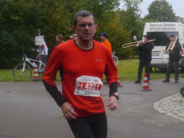 Gleich sind wir an der Alb. Eine Guggenmusik (wurde auch Zeit) dreht voll auf und die „Halben“ gleich durch. Auf dem letzten Kilometer wollen sie die verbummelten zwanzig davor vergessen machen. Auf einer Tanzbühne wird gerockt und gerollt, Marathonis laufen gerade aus, die „Halben“ rechts Richtung Europahalle und Stadion ins Ziel. Ohne mit der Wimper zu zucken bleibe ich auf Marathonkurs.