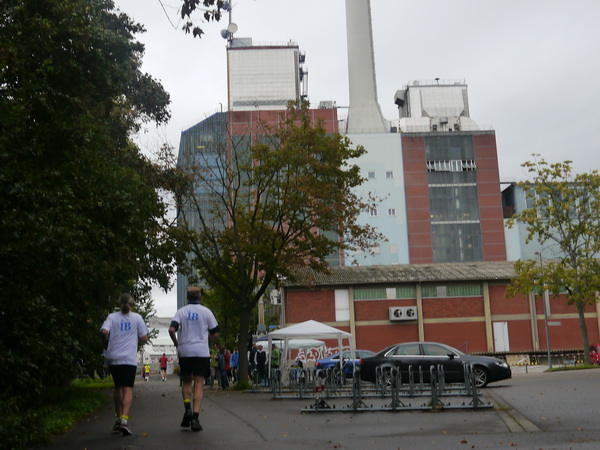 Durlach  (km 7) ist nicht nur im Karneval eine Stimmungshochburg, auch der Marathon wird hier euphorisch gefeiert. Wir schlagen jetzt südwestliche Richtung ein. Deutlich bekommen wir demonstriert, welcher Strukturwandel sich in den letzten 60 Jahren vollzogen hat. Das Fabrikgelände mit dem riesigen Backsteinschornstein r des Nähmaschinen-, Fahr- und Motorradherstellers Gritzner, der 1957 von Pfaff übernommen wurde, sehen wir auf der linken Seite.