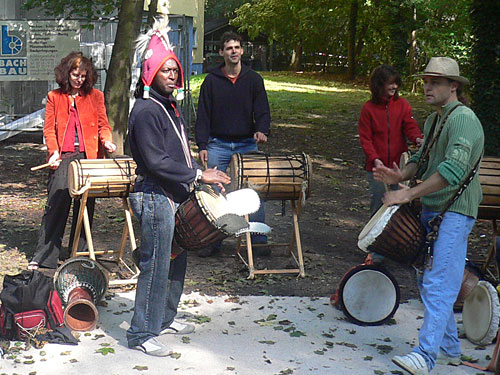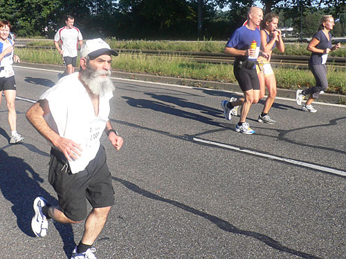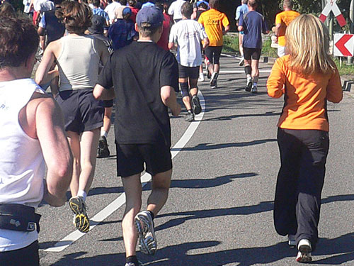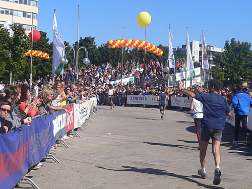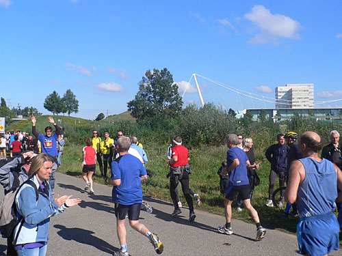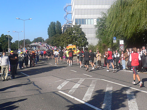 Nach km 26 ist es vorbei mit der Landschafts-Idylle, die Stadt zeigt ihr anderes, ihr eher stristes Gesicht. Wir sind am Rheinhafen, überqueren die A 10 nach Landau und kommen nach Mühlburg (km 28) und laufen durch die Hardt- und Hertzstraße. Die Uhr der St. Konrad-Kirche schlägt gerade 12.00 Uhr, als wir km 29 passieren. An der Verpflegungsstelle gleich darauf ist wieder eine Riesen-Stimmung. Weiter geht es zum alten Flugplatz (km 30) und später in die Knielinger Allee (km 32). Die Brücke über den Adenauerring, der zum Wildparkstadion führt, ist bestimmt die vierte alleine auf den letzten Kilometern. Ohne solche Anstiege wäre die Strecke vollkommen flach. Auch in diese sonst ruhige Gegend haben sich eine Trommlergruppe und zahlreiche Fans „verirrt“.