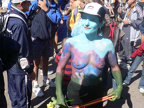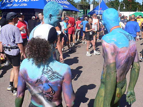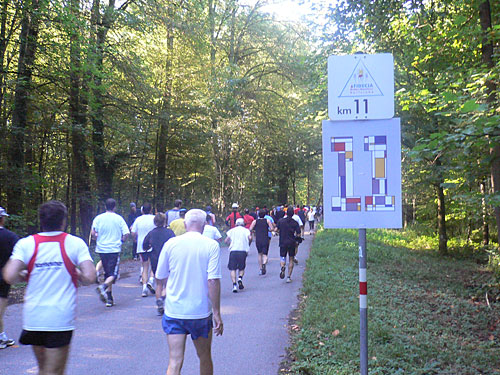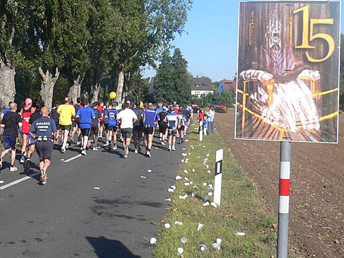 Die Kilometer-Schilder sind übrigens in Karlsruhe etwas ganz Besonders. Sie sind von Künstlern gestaltet und in einem Kalender für 2006 zusammengefaßt. Jeder Teilnehmer hat mit den Startunterlagen einen solchen bekommen.