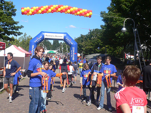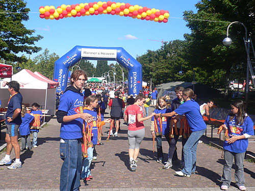 Die Verpflegung im Runner’s Heaven ist bestens. Kuchen, alle möglichen Getränke bis zum alkoholfreien Bier und Obst gibt es bis zum Abwinken. Dahinter können dann gleich die Kleidertaschen in Empfang genommen werden. Duschen sind in der Europahalle. Das ist alles gut durchdacht und organisiert. Da kann niemand meckern. Das herrliche Wetter trägt wesentlich zur guten Stimmung bei. Auf dem Platz vor der Europahalle herrscht reges Treiben. Viele bleiben und feiern ihren Sieg.