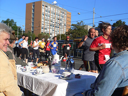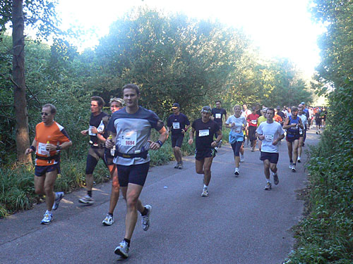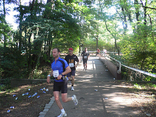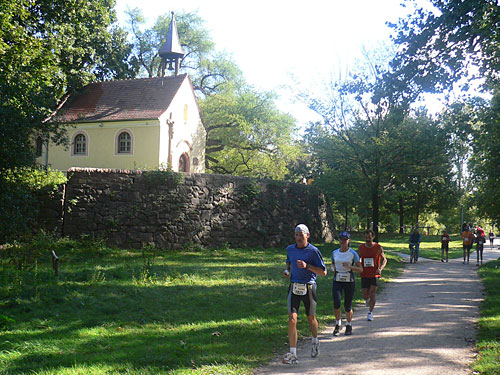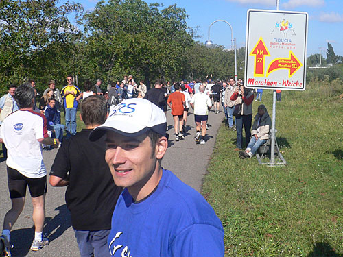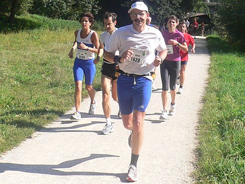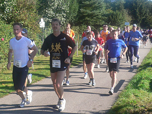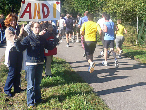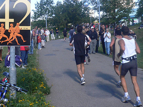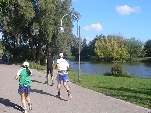 Die nächsten 5 Kilometer sind einmalig schön und für einen Citymarathon eher ungewöhnlich. Wir laufen entlang der Alb durch herrliche Grün- und Freizeitanlagen, vorbei an Ausflugslokalen und überqueren das Flüsschen dabei mehrfach. Das Laufen macht hier allen unheimlich Spaß. Entsprechend gut ist die Laune. Es wird gescherzt und gelacht, von Wettkampfstress keine Spur. Ich komme mit Ulrich ins Gespräch, er ist einer der 100 Fiducia-Starter. 1989 und 1990 hat er zum letzten Mal an einem Marathon teilgenommen und will es jetzt noch einmal wissen. Seine Zielzeit ist 4:12 Stunden, besser als vor 15 Jahren (er schafft es in 4:08, Glückwunsch). Natürlich sind hier keine Zuschauermassen. Aber viele Ausflügler und Spaziergänger genießen den schönen Spätsommertag und klatschen respektvoll. Die eine oder andere Fangruppe hat sich aber auch hier postiert.
