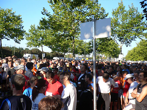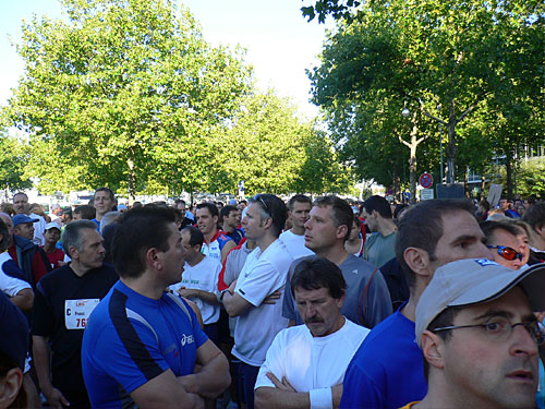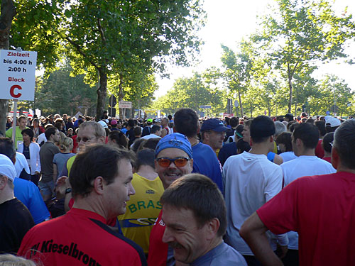 40 Minuten noch bis zum Start. Gegenüber der Halle werden die Kleidertaschen deponiert. Das geht schnell und problemlos. Jetzt noch ein sonniges Plätzchen für die restliche Wartezeit. Der Start der 9.600 Marathon- und Halbmarathon-Läufer erfolgt in der Hermann-Veith-Straße, zeitversetzt in verschiedenen Blocks. An den Zugängen der vorderen Blocks wird kontrolliert. Im Block C (bis 4:00 Stunden) nicht mehr. Deshalb stehen dort auch bunt gemischt fast alle anderen, im Block D nur noch ein kleiner Rest.
