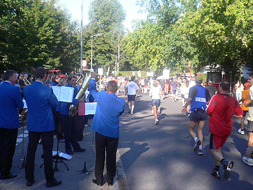 In Beiertheim geht es scharf links zur Breiten Straße (km 20). Eine Rockband spielt zur Unterhaltung der Zuschauer und der Läuferinnen und Läufer. Die Stimmung könnte nicht besser sein. Das geht jetzt durchgängig, bis die „Halben“ rechts ins Ziel laufen und es für die Marathonis gerade aus weiter geht.