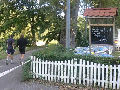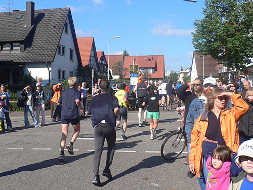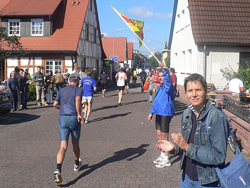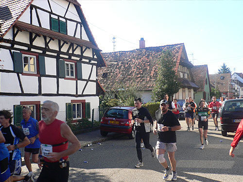 Weiter geht es durch die Rastatter Straße und den Scheibenhardter Weg zum Belchenplatz (km 15,7) wo eine Rockband kräftig einheizt. Der nächste Kilometer führt wieder durch Wald, ein kurzes Stück geht es parallel zur B 10 (Gut Scheibenhardt mit dem Golfplatz liegt gegenüber) und wir erreichen nach einer Eisenbahnbrücke Bulach auf der Litzenhardtstraße (km 18). Herrliche Fachwerkhäuser und fast ländliche Idylle erwarten uns hier, aber auch viel Applaus von den zahlreich versammelten Anwohnern. Die Verpflegungsstelle ist komplett bestück und weit auseinander gezogen. Wenn sich nicht alle auf den ersten Tisch stürzen, gibt es kein Gedränge. Meist werden Wasser, Iso, Apfelschorle, Bananen und Riegel angeboten. Dazu Schwämme zum Abkühlen.