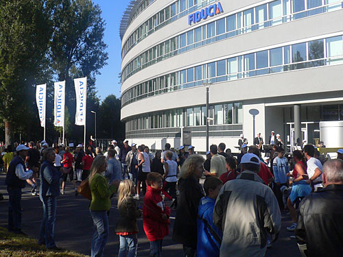 Bei Kilometer 6 geht es über die A 5. Im Hintergrund sehen wir den Turmberg und sind auch gleich in Durlach. Dort, wo es scharf rechts in die Ernst-Friedrich-Straße geht, haben sich viele Menschen versammelt, um die Läuferinnen und Läufer anzufeuern. Eine tolle Stimmung. Von wegen, „die Karlsruher können das nicht“. Knapp 10 Kilometer sind wir gelaufen, als wir das Verwaltungsgebäude der Fiducia erreichen. Der neue Hauptsponsor hat nicht nur über 100 Mitarbeiterinnen und Mitarbeiter auf die Strecke „geschickt“, sondern auch ein richtiges Fest organisiert. Entsprechend ist der Andrang und die Stimmung hier.