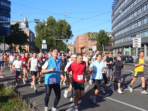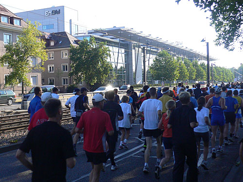 Um 9:00 Uhr dann der Start des ersten Blocks. Schon fünf Minuten später sind wir an der Reihe. Gleich geht es links in die Bauerstraße, vorbei am ZKM (Zentrum für Kunst- und Medientechnologie) mit dem großen Filmpalast und nach gut einem Kilometer rechts in die Kriegstraße. Die breite Straße ist unserer Laufrichtung komplett für den Verkehr gesperrt. Wir laufen im Schatten und es ist noch recht frisch. Das Läuferfeld ist dicht und es dauert eine ganze Weile, bis man einigermaßen seinen Rhythmus findet. Viele Zuschauer sind noch nicht an der Strecke. Aber die vereinzelten Fangruppen machen mächtig Lärm und klatschen sich warm. Nach 3,5 Kilometern sind wir auf der Durlacher Allee und sehen links den gläsernen Verwaltungspalast der EnBW.