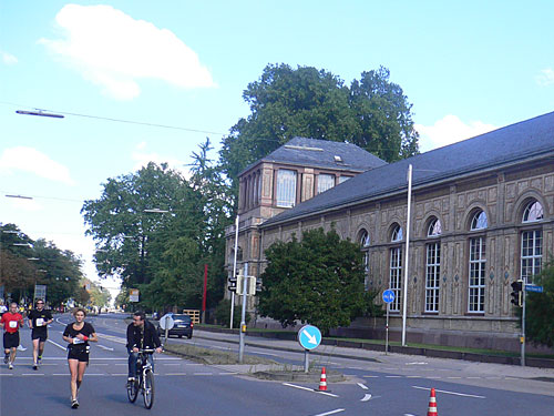 Wir erreichen jetzt die Günter-Klotz-Anlage, wo die Stadt Karlsruhe alljährlich für ihre Bürger gratis ein mehrtägiges Rock-Spektakel veranstaltet. Das Läuferfeld hat sich nach der Streckenteilung deutlich gelichtet.