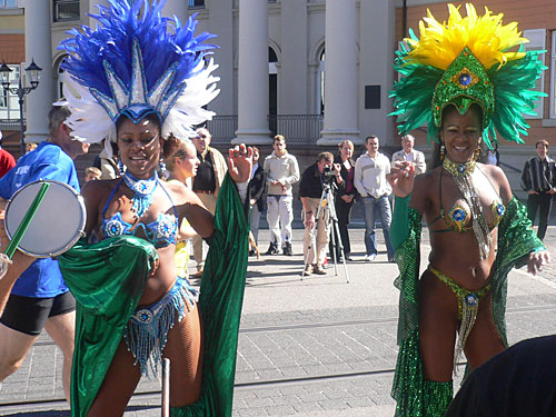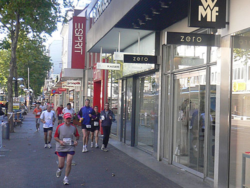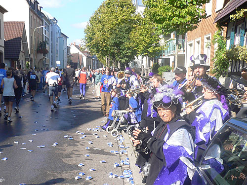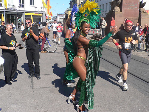 Hier ist nun der absolute Stimmungshöhepunkt, und spätestens jetzt kann ich meinen Bekannten („die Karlsruher können das nicht“) überhaupt nicht mehr verstehen. Die Karlsruher können das doch, und wie. Auf den 1000 Metern zwischen Marktplatz und Ettlinger Tor, dem neuen Karlsruher Einkaufszentrum, tobt der Bär. Läuferinnen und Läufer werden namentlich aufgerufen und von Hunderten begeisterten Zuschauern gefeiert. Drei Musikkapellen spielen auf diesem Abschnitt. Samba-Tänzerinnen dürfen mittlerweile ja bei keinem Marathon mehr fehlen. Die hier in Karlsruhe verdienen aber einen Extra-Preis.